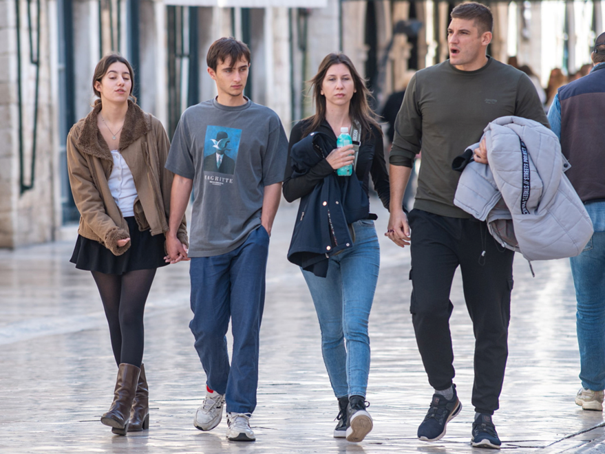 Dok su se kroz Zadar i Šibenik nizali ležerni, urbani lookovi, na Stradunu se posebno isticala svečanija atmosfera. Šetajući među turistima i domaćima, pažnju su privukli i mladenci koji su svojim svečanim izdanjem unijeli dašak glamura u već živopisnu dubrovačku subotu. Njihova prisutnost savršeno se uklopila u razigrani miks modnih izbora koji su danas definisali ulice juga.