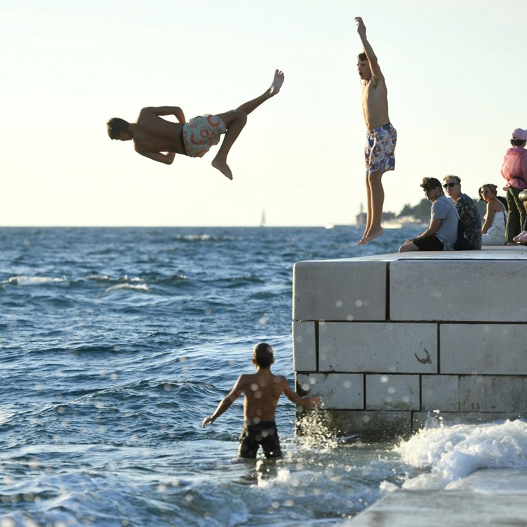 Kao i obično, dok neki već večeraju i kreću u šetnje, drugi se još ne daju s plaže. Fotografi su zabilježili i prizore kupača koji su uživali među valovima, kao i onih koji su skakali sa zadarskih Morskih orgulja i rive u more.