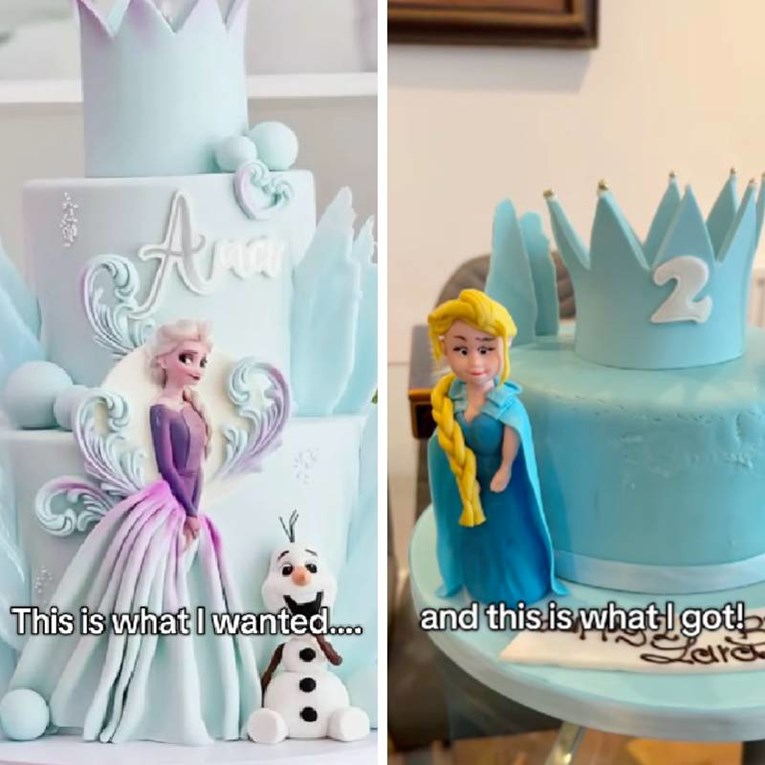 JEDNA je majka ostala zgrožena nakon što je za rođendan svoje kćeri naručila tortu s temom popularnog crtića Snježno kraljevstvo, no ono što je dobila nije nimalo nalikovalo fotografiji s interneta. Samara je na TikToku podijelila fotografiju torte koju je željela – elegantnu, svijetloplavu, na dva kata, s likovima Else i Olafa iz Disneyjeva hita.