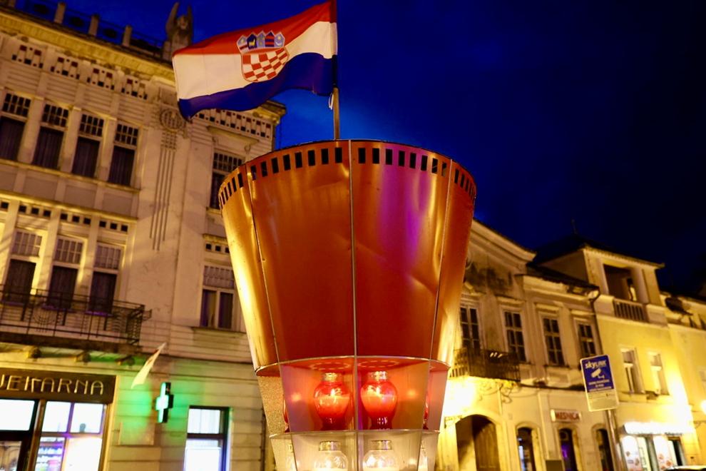 I osječki pješački most osvijetljen je crvenom i bijelom bojom, u spomen na važnu obljetnicu.