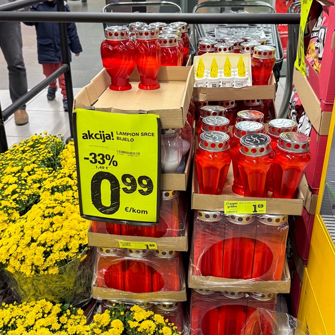 Obišli smo i dvije trgovine, gdje su se multiflore prodavale po cijenama od 5.99 do 8.99 eura, dok je u jednoj bila akcija s početnom cijenom od 4.99 eura. U ponudi su bili i razni lampaši - od klasičnih i električnih do onih u setovima. Cijene lampiona kreću se od 0.99 eura naviše. Pogledajte što smo sve pronašli u galeriji pri vrhu teksta.