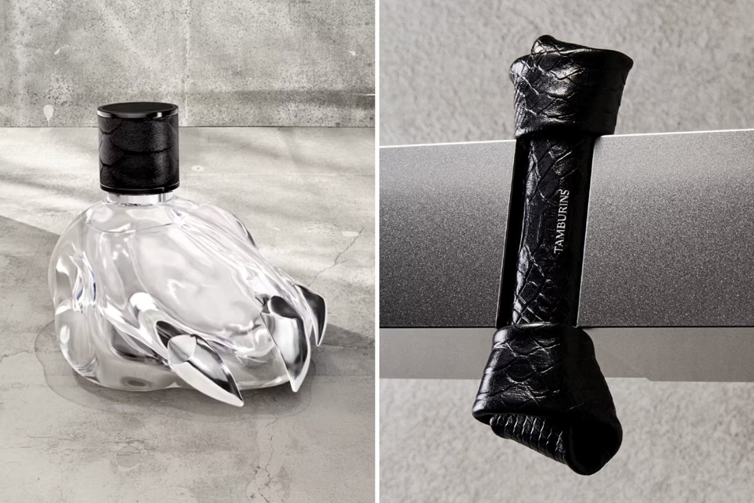Posebnu pozornost privlači skulpturalno pakiranje koje naglašava dvojnu prirodu kolekcije. Jedna bočica oblikovana je kao staklena šapa s metalnim kandžama i kožnim čepom, dok druga imitira igračku za žvakanje u obliku kosti, omotanu crnom ili bijelom umjetnom krokodilskom kožom.