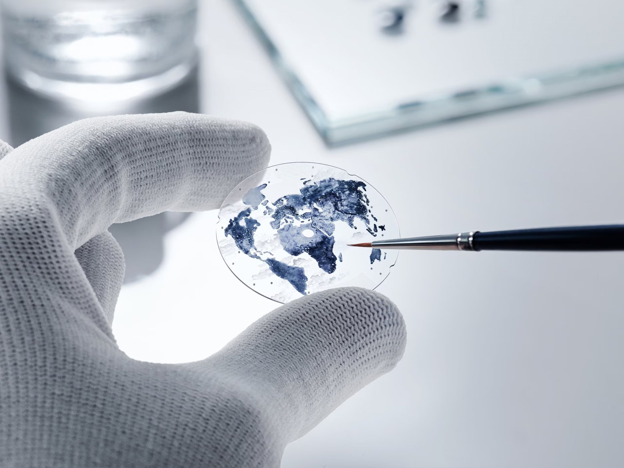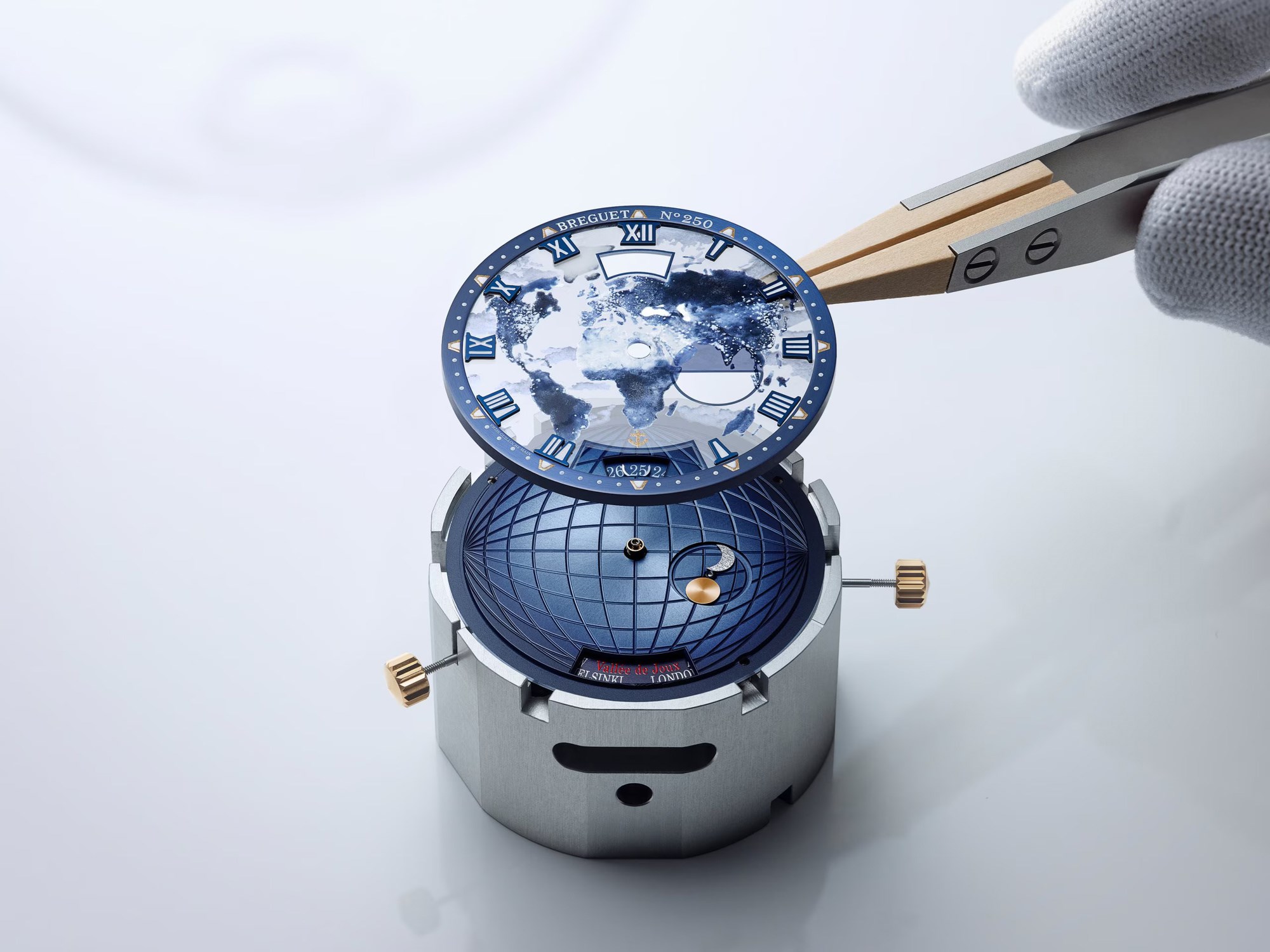 Preko njega postavljen je prozirni safirni disk koji nosi tri faze ručno oslikanog minijaturnog emajla: kontinente ugravirane i pečene u grand feu tehnici, plutajuće oblake na površini kristala i fosforescentne točkice koje predstavljaju gradska svjetla. Ovaj složeni i patentirani rad s emajlom osigurava da nijedan brojčanik - i nijedan noćni krajolik - nikada nije potpuno isti.