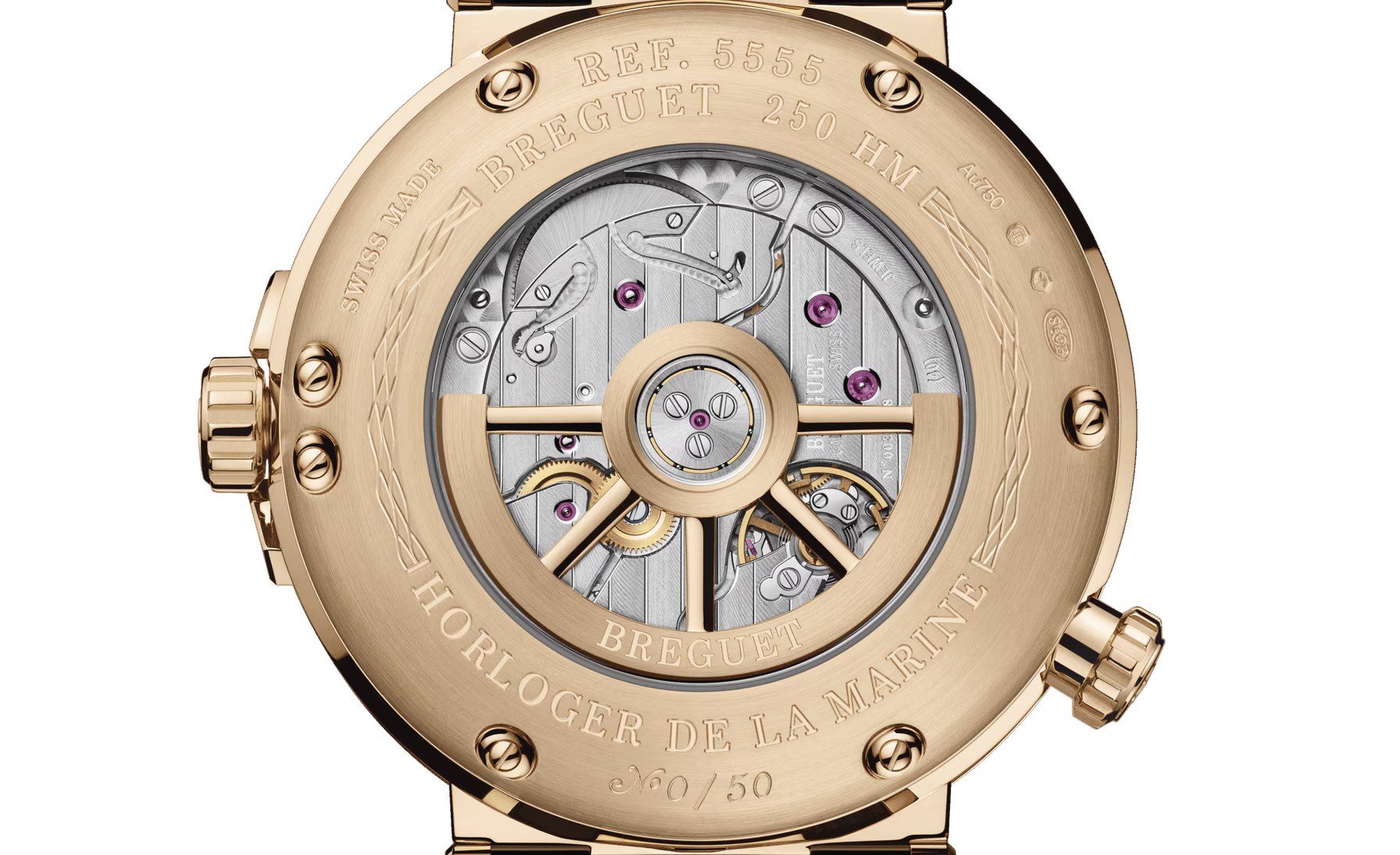 Kroz safirno staklo na poleđini kućišta vidljiv je zlatni rotor i guilloché ukras s natpisom Quai de l’Horloge povodom 250. obljetnice, odajući počast pomorskoj baštini Abrahama-Louisa Bregueta te spajajući tehničko majstorstvo sa stoljetnim umijećem izrade.