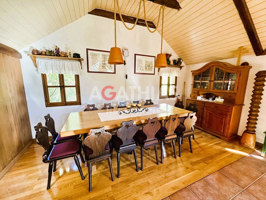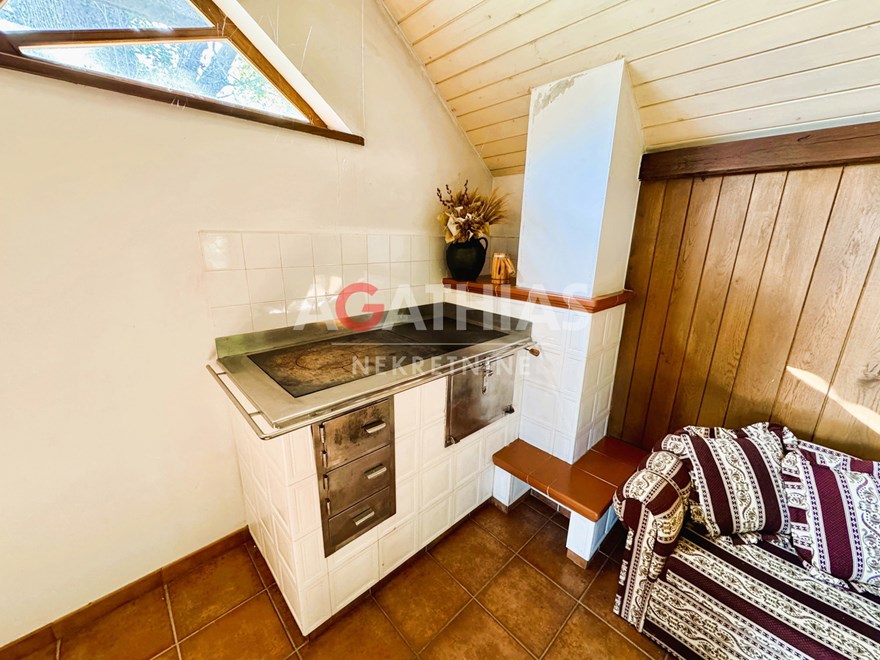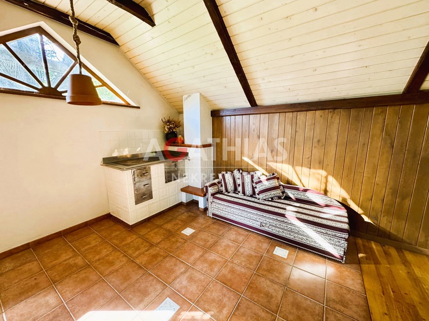 U prizemlju, odnosno podrumskom dijelu kuće, nalazi se dodatni prostor za druženje koji uključuje blagovaonski stol, sanitarni čvor i malu, autentičnu vinoteku. U oglasu se ističe da se kuća prodaje potpuno namještena i spremna za korištenje.
