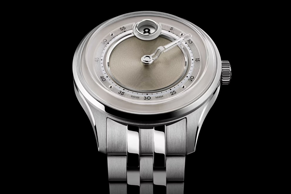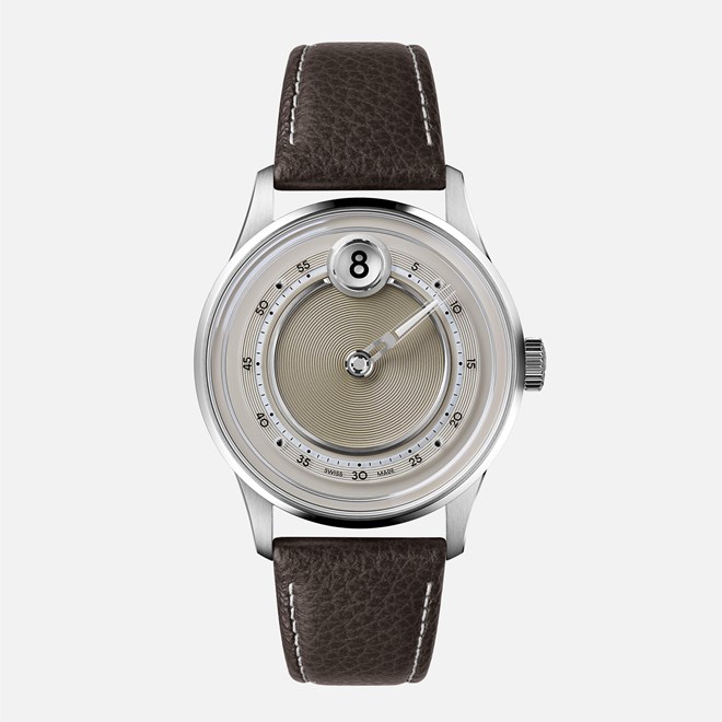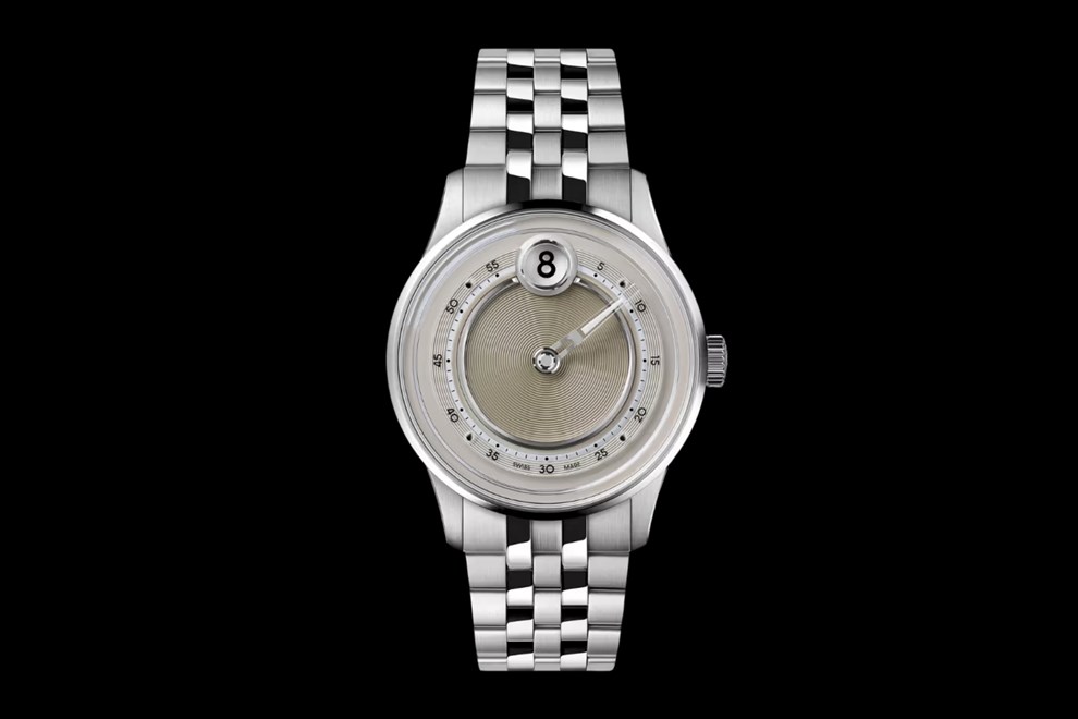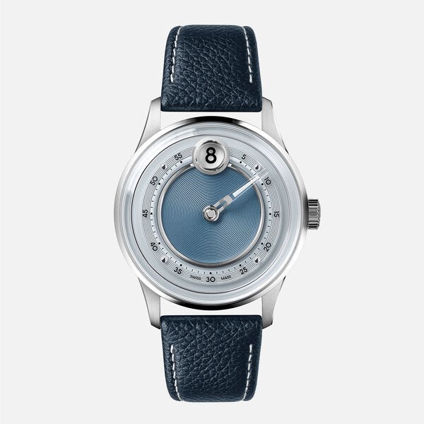 Središnji dio brojčanika ukrašen je koncentričnim krugovima, okružen brušenim i poliranim metalnim prstenovima, dok safirna minutna staza stvara iluziju lebdenja.