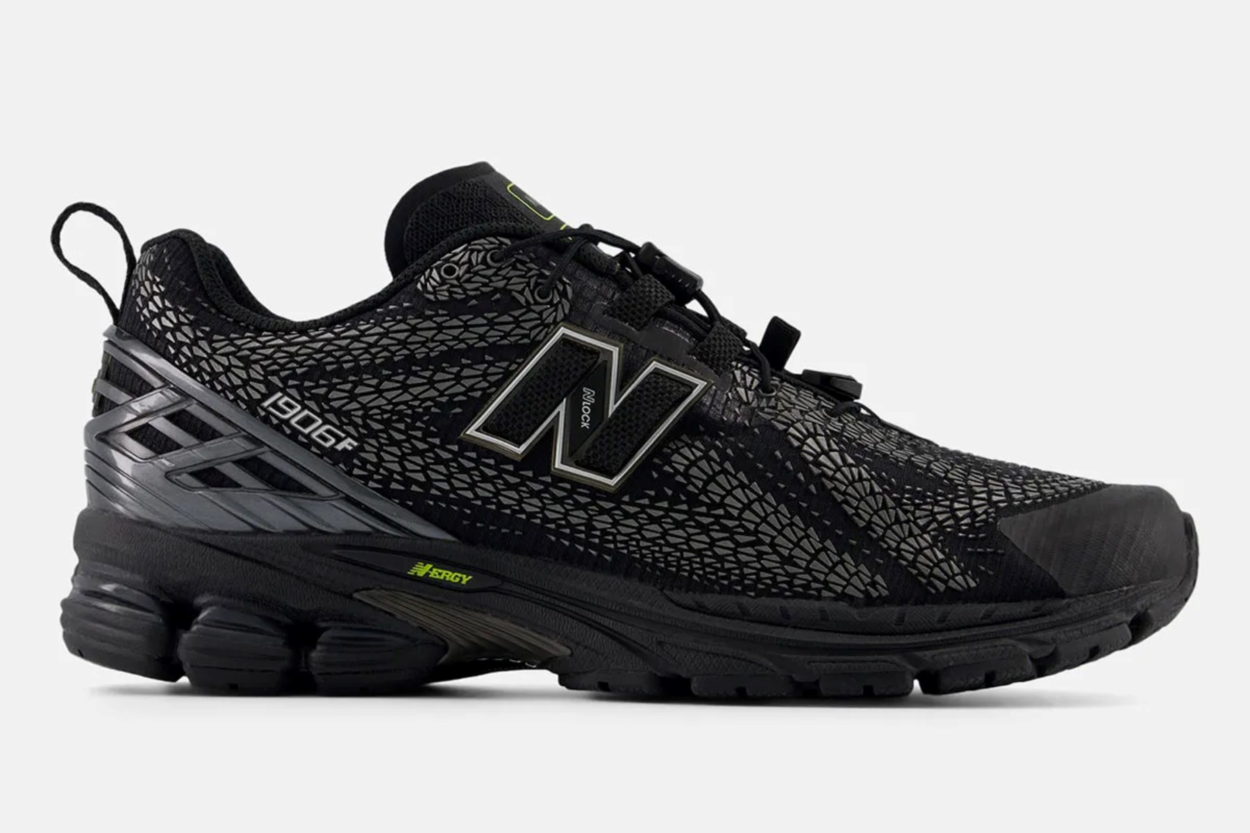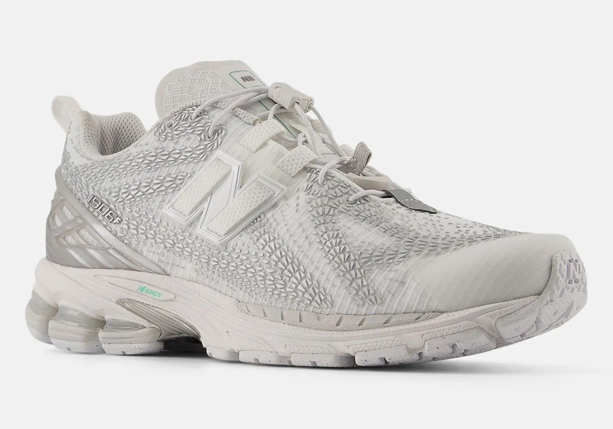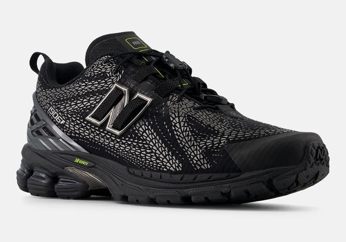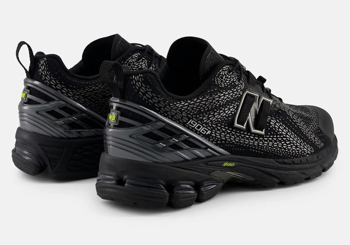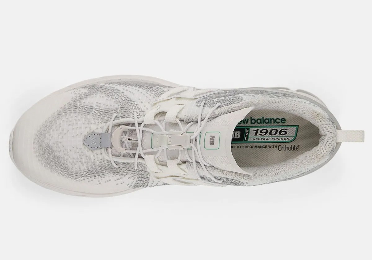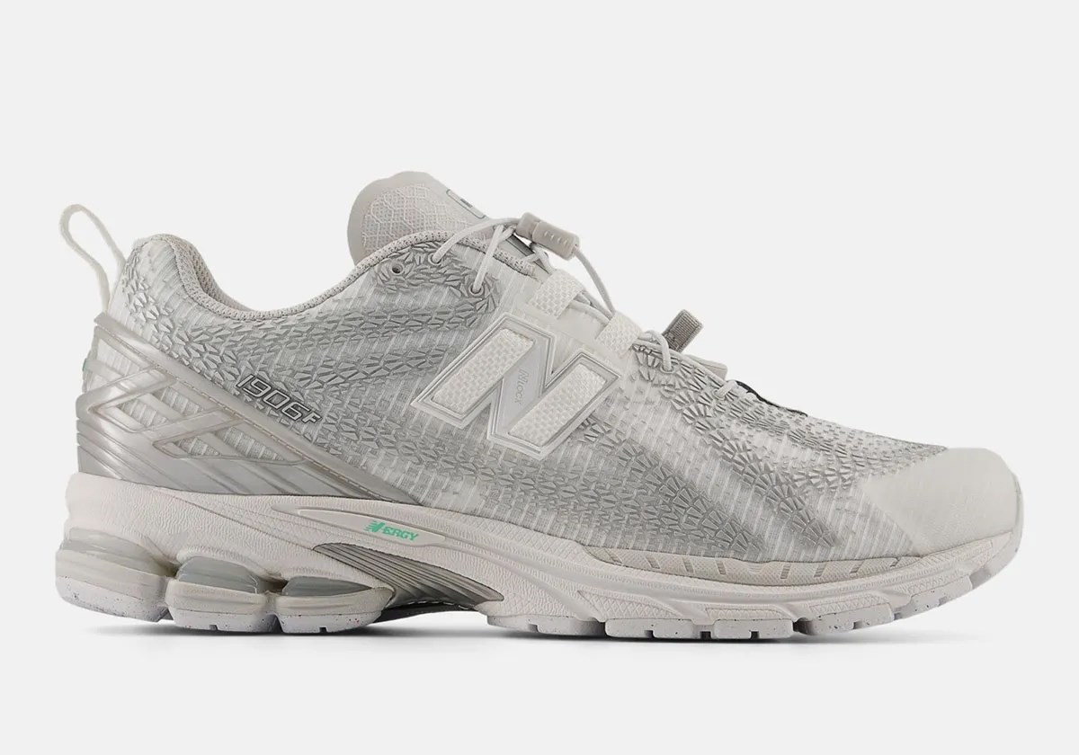 Model 1906F ima elegantnu sintetičku bazu, sličnu onoj viđenoj na 1906R No-Sew seriji. Ono što ga čini posebnim je razgranata mreža TPU detalja na gornjem dijelu tenisice, koja zamjenjuje tradicionalne presvlake od brušene ili glatke kože. Ovi detalji, koji podsjećaju na tragove guma ili ljuske gmazova, daju tenisici suvremen i teksturiran izgled.