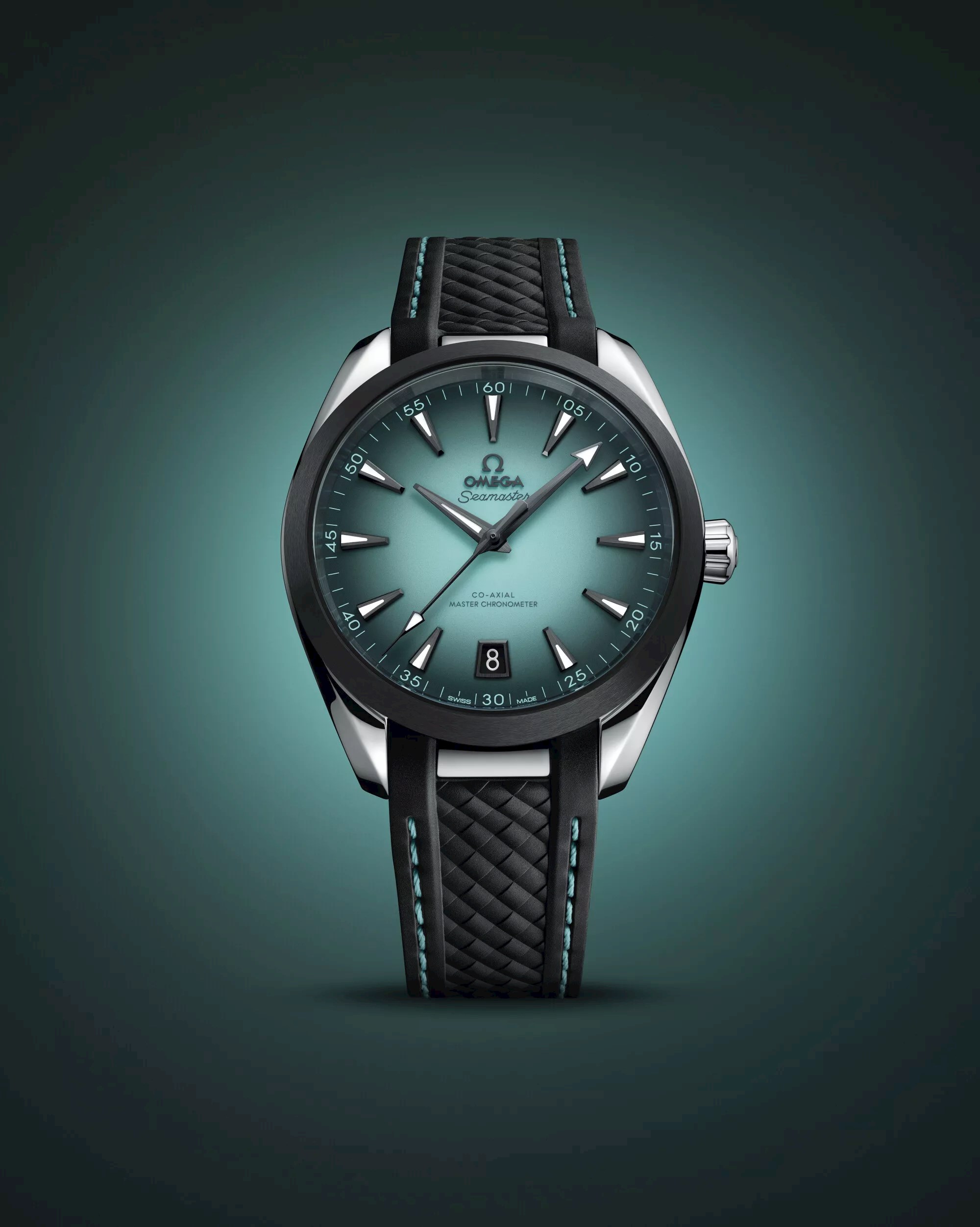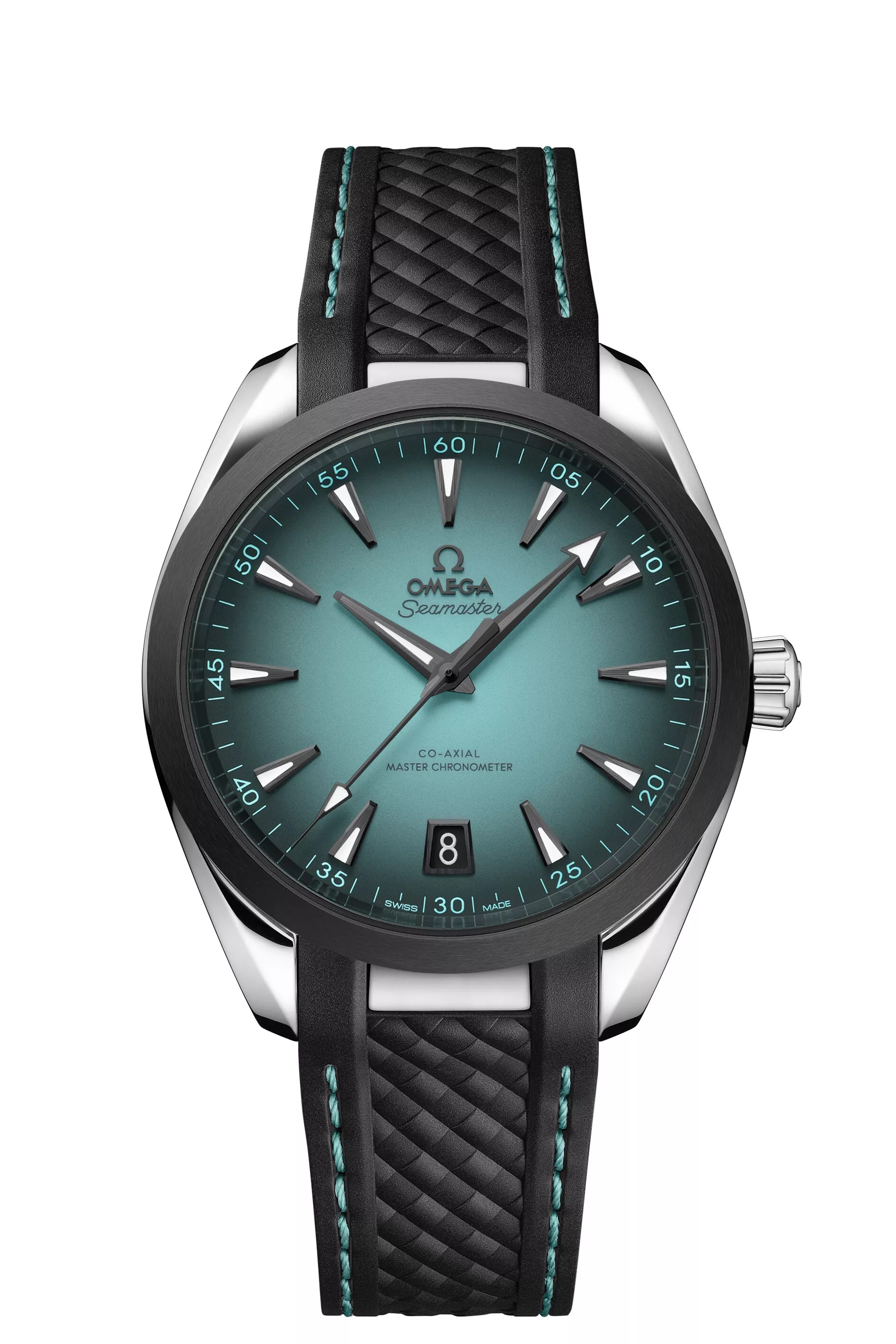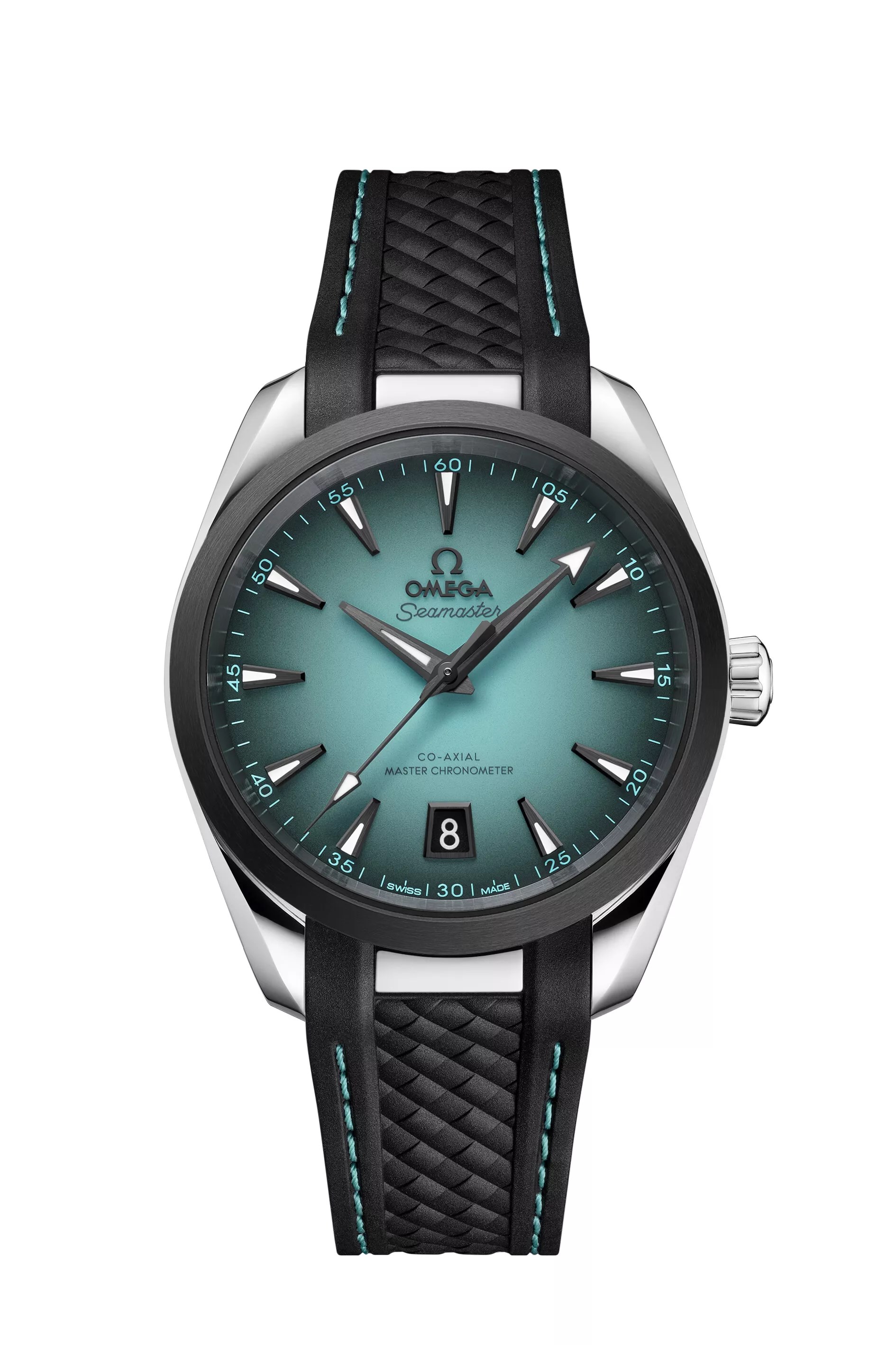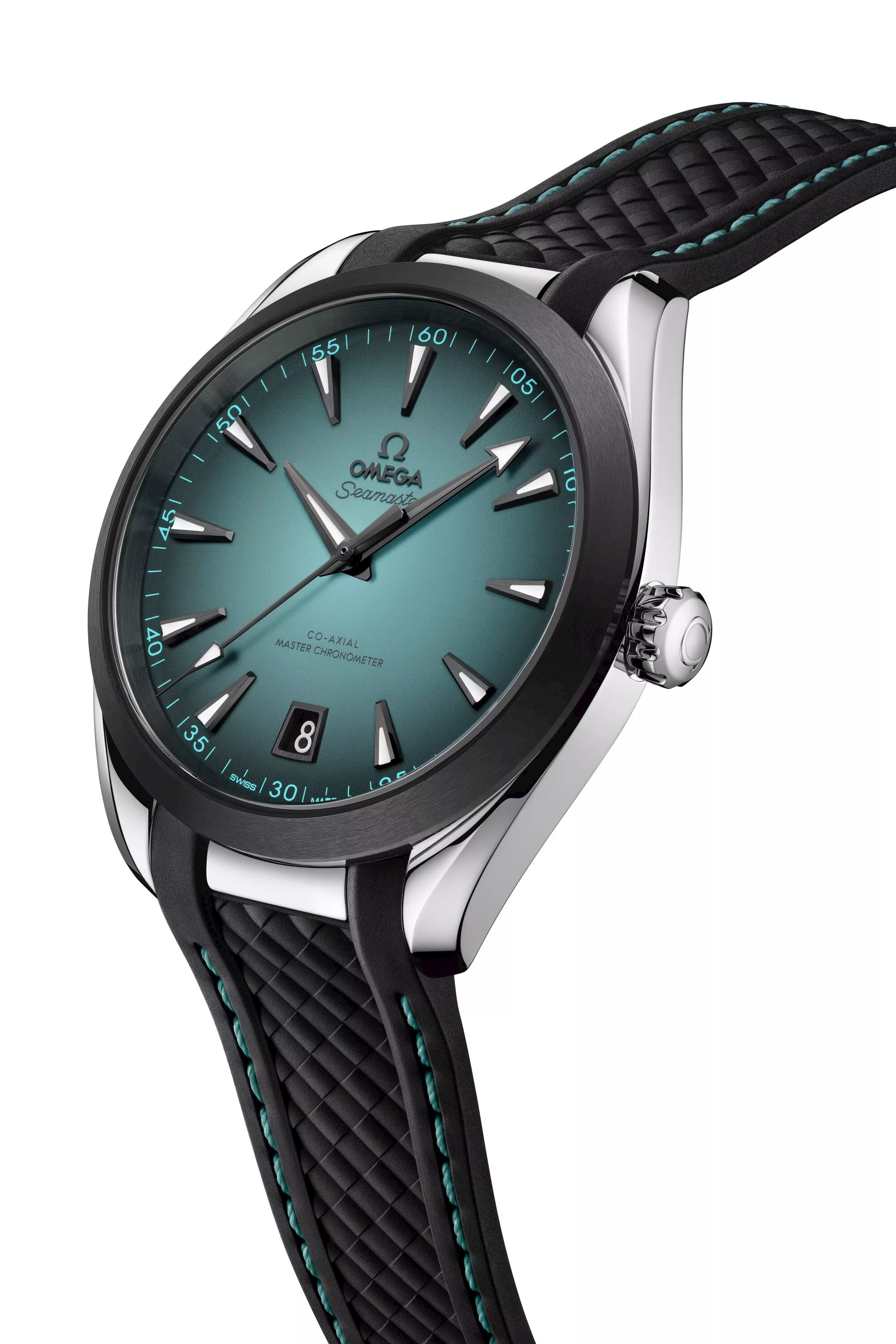 Manje od godinu dana nakon što je lansiran prvi Aqua Terra u tirkiznoj varijanti, novi model dobiva mat crni keramički okvir koji stvara kontrast sjajnom brojčaniku s gradijentom i crnim PVD oznakama. Umjesto čelične narukvice, tu je gumeni remen u integriranom stilu s tirkiznim šavovima, piše Hodinkee.