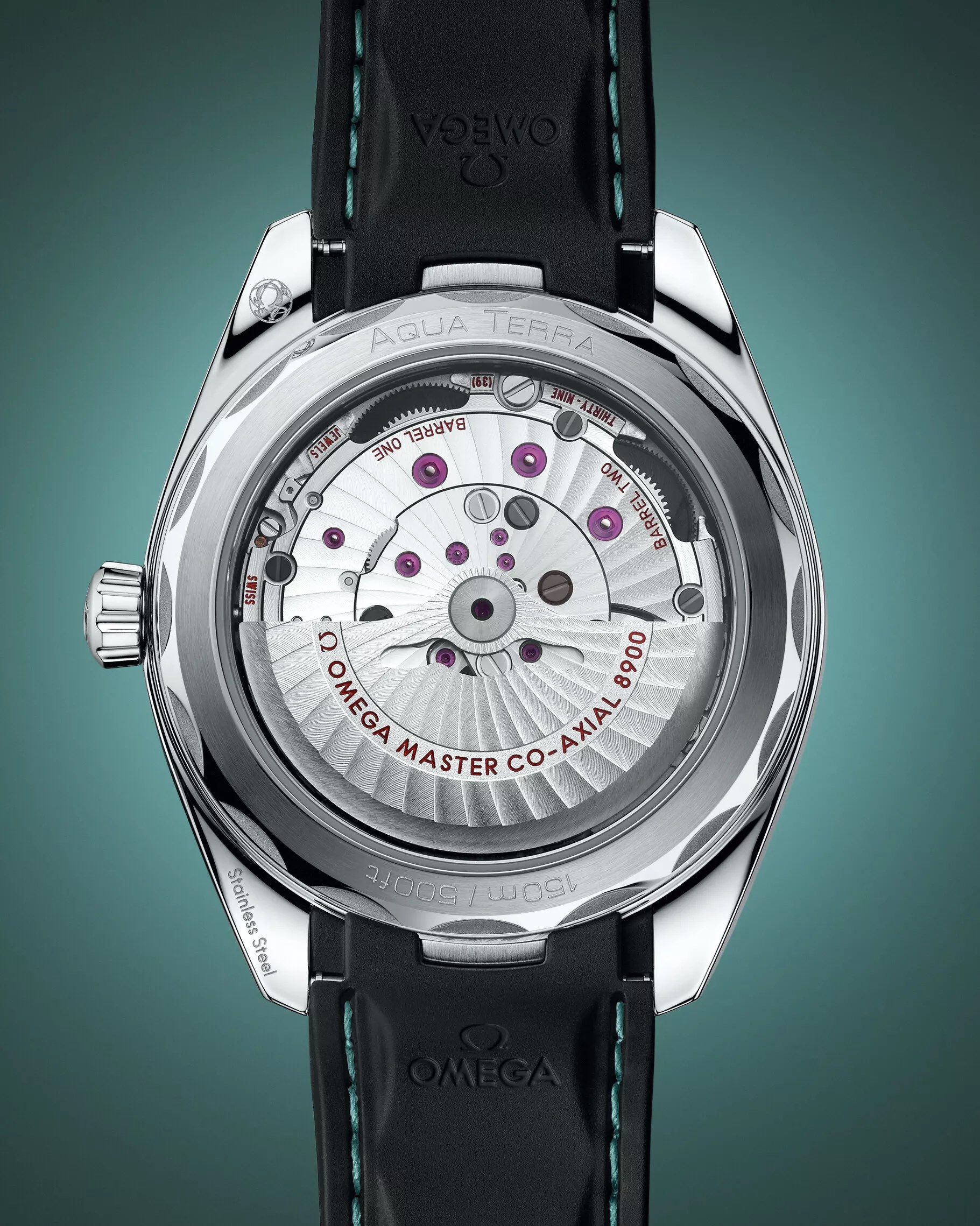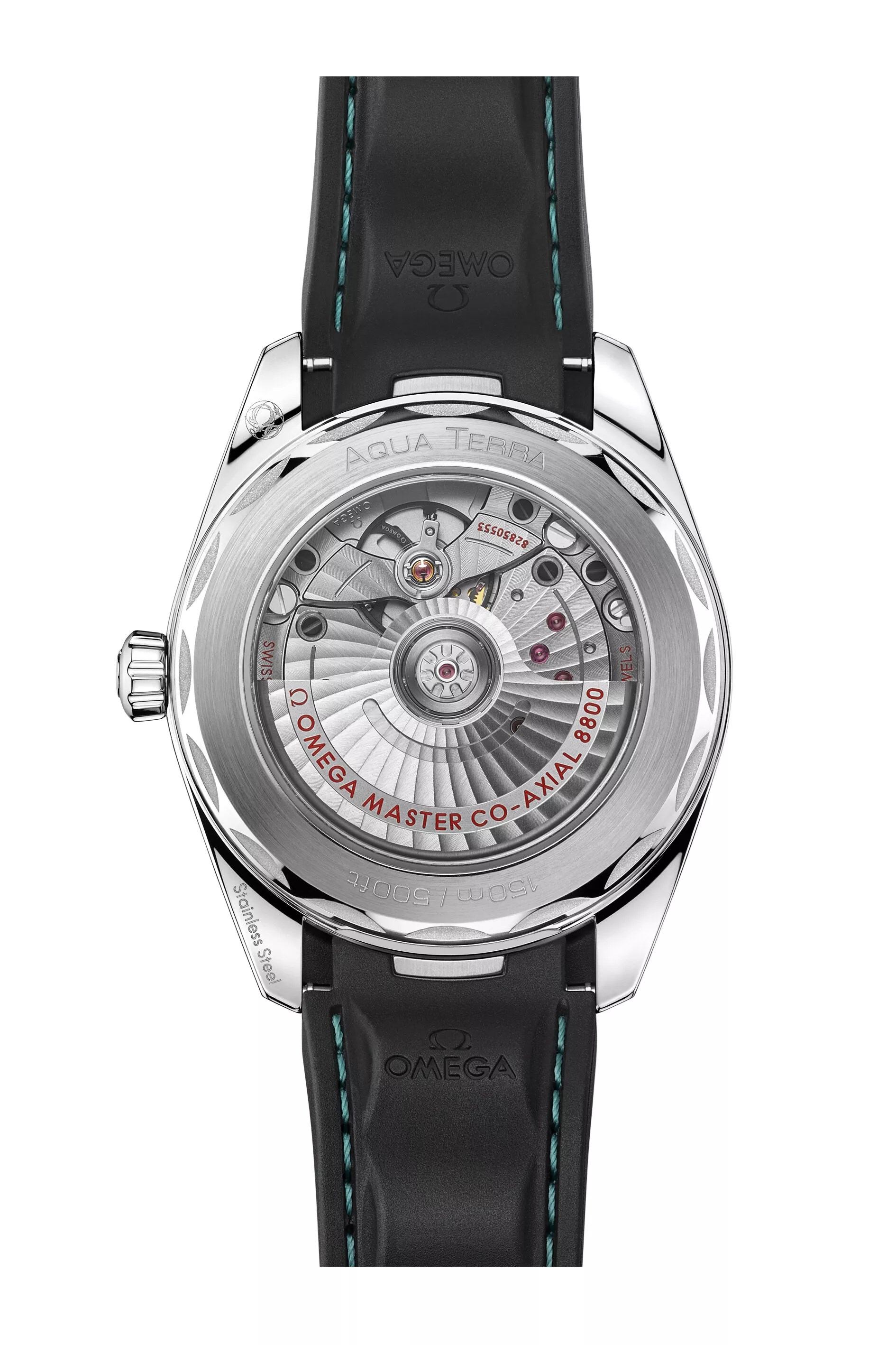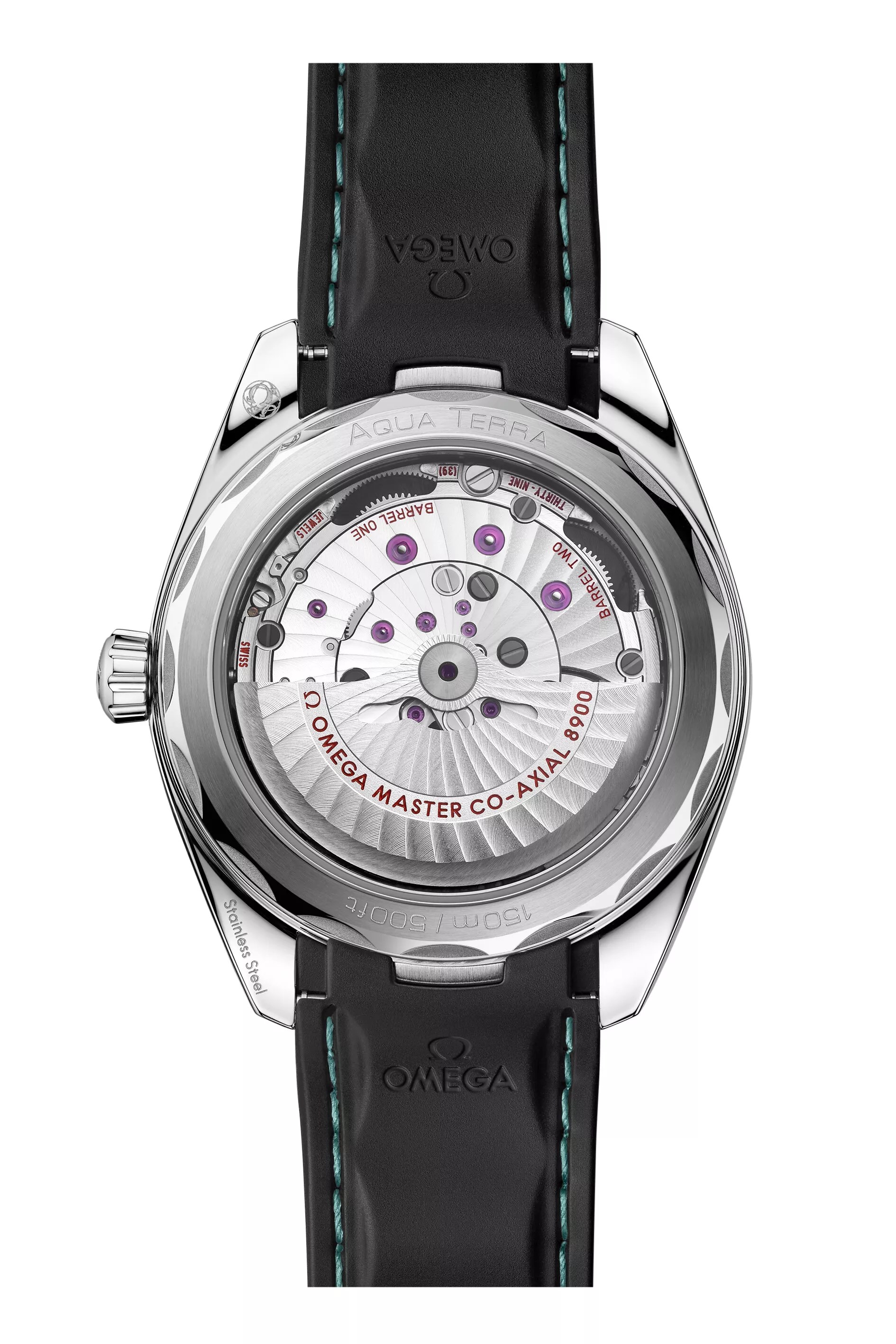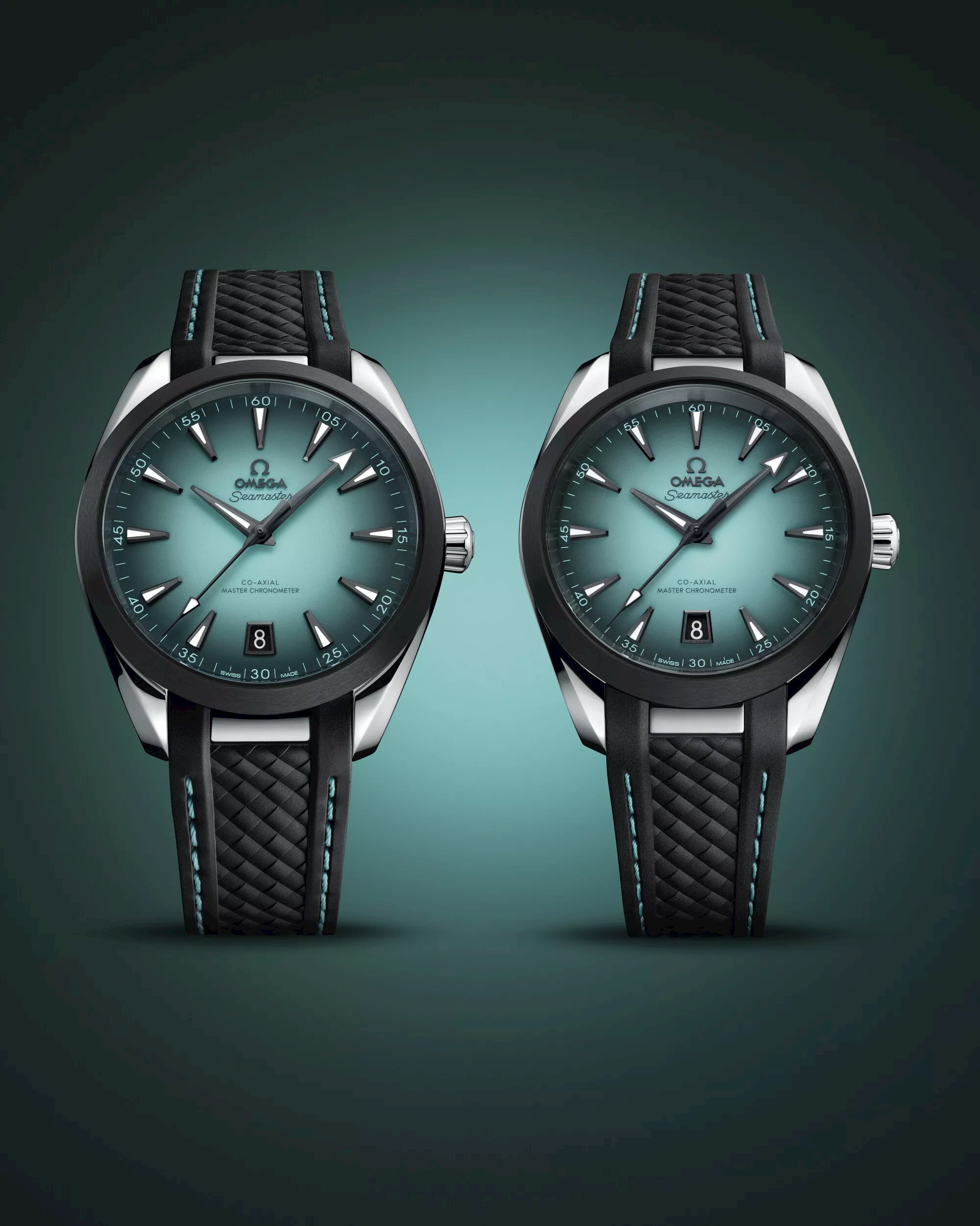 Manje od godinu dana nakon što je lansiran prvi Aqua Terra u tirkiznoj varijanti, novi model dobiva mat crni keramički okvir koji stvara kontrast sjajnom brojčaniku s gradijentom i crnim PVD oznakama. Umjesto čelične narukvice, tu je gumeni remen u integriranom stilu s tirkiznim šavovima, piše Hodinkee.