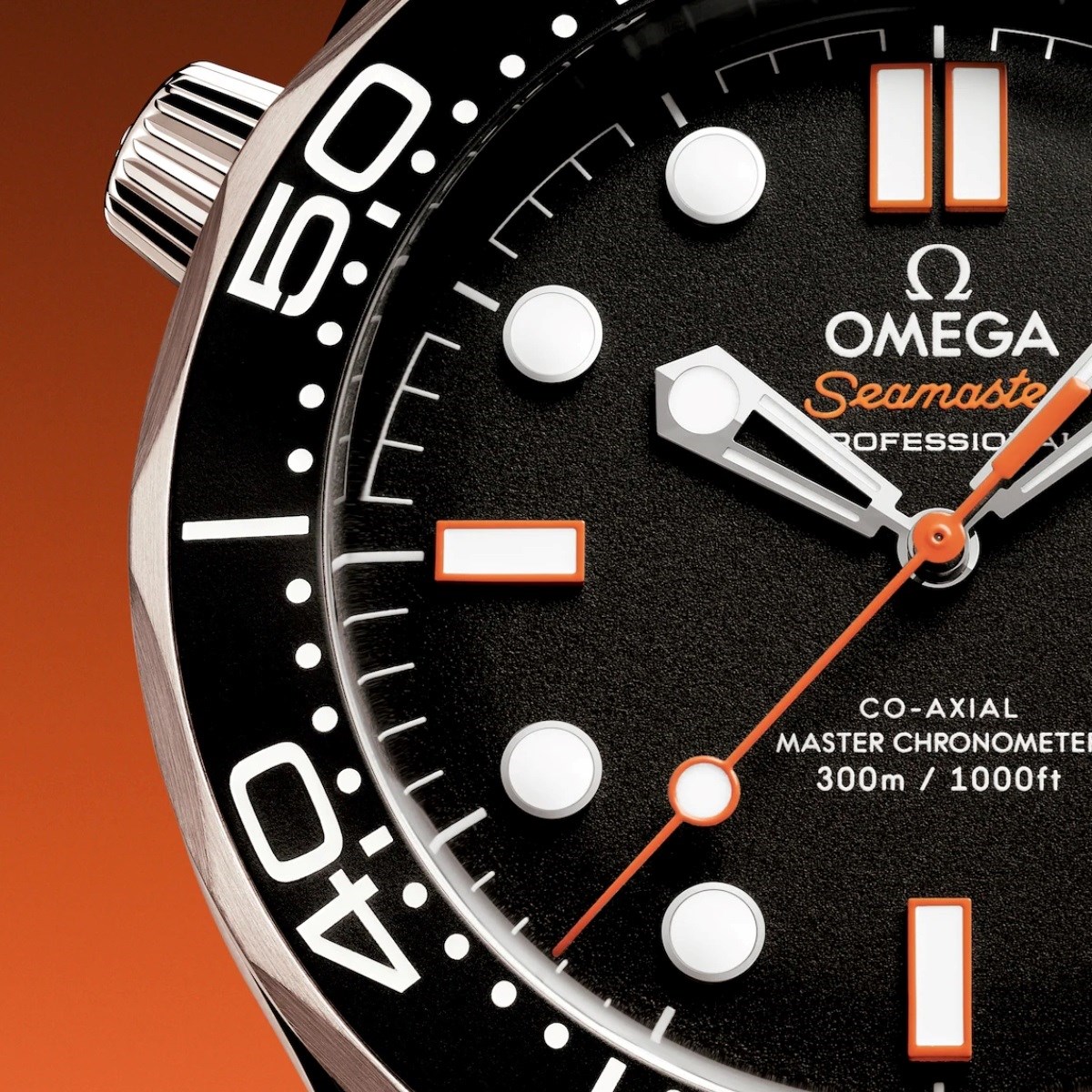 Dinamiku mu daju upečatljivi narančasti detalji: sekundna kazaljka u obliku lizalice premazana je sjajnim narančastim lakom, kao i pravokutni indeksi na pozicijama 12, 3, 6 i 9 sati. U istoj boji ističe se i natpis Seamaster ispod Omega logotipa.
