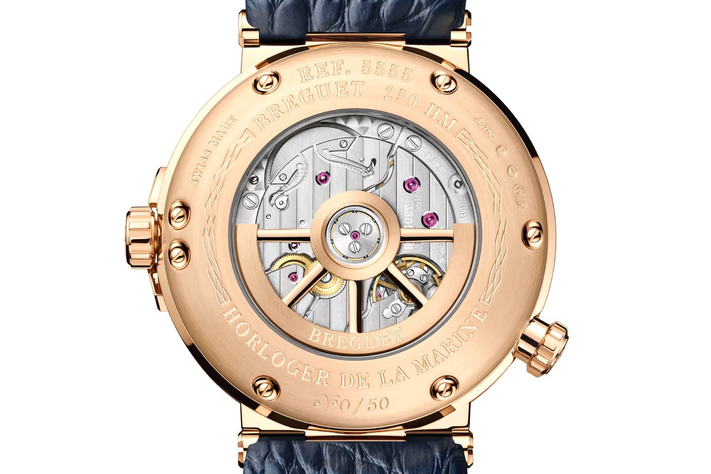 Kroz safirni poklopac kućišta zlatno obojeni oscilirajući uteg i gijoširani okvir Quai de l’Horloge, izrađen povodom 250. obljetnice, odaju počast pomorskoj baštini Abrahama-Louisa Bregueta, spajajući tehničko majstorstvo sa stoljetnim umijećem.