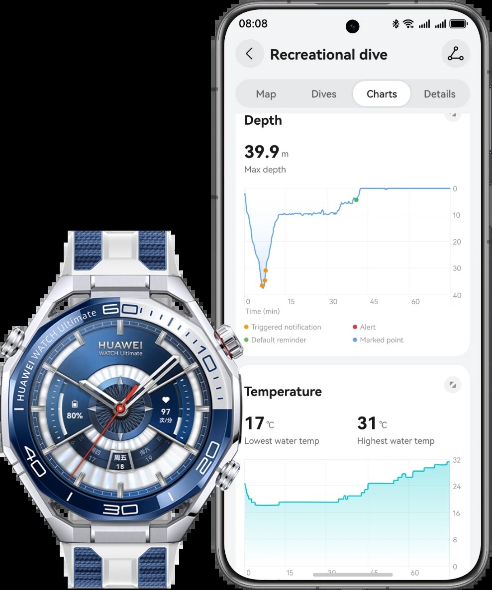 No, to nije sve. Watch Ultimate 2 prvi je pametni sat na svijetu koji podržava podvodnu komunikaciju temeljenu na sonaru. Ova inovativna tehnologija omogućuje slanje unaprijed postavljenih poruka i emotikona drugim kompatibilnim satovima u radijusu od 30 metara. Uz to, integrirana je i podvodna SOS značajka koja može slati upozorenja uređajima unutar dometa od 60 metara.