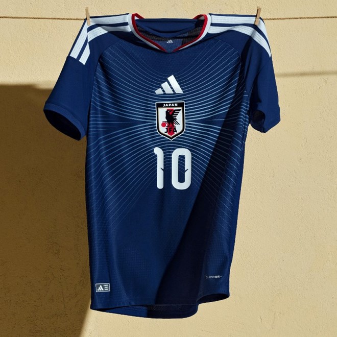 Klasična plava boja japanskog dresa oživljena je apstraktnom grafikom s pepeljasto plavim linijama, koje odražavaju poznatu izmaglicu na horizontu gdje se susreću nebo i more. Japanska zastava ponosno stoji kao oznaka na ovratniku.