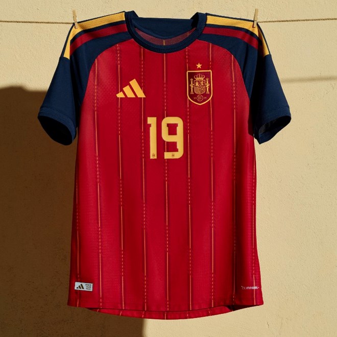 Domaći komplet Španjolske dolazi u čistom, prugastom izdanju. Crvena podloga naglašena je ponavljajućim žutim vertikalnim linijama, koje vuku inspiraciju iz nacionalne zastave i grba. Riječ "ESPAÑA" ispisana je na stražnjoj strani ovratnika.