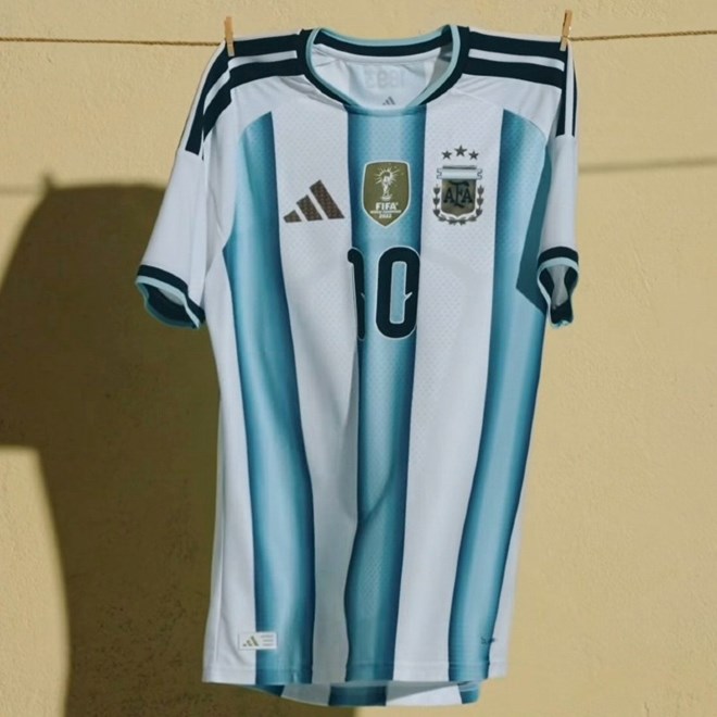 Argentinske nebesko plave i bijele pruge dobile su novi izgled s jedinstvenim efektom blijeđenja u tri boje, inspirirane tonovima s tri pobjednička dresa sa Svjetskih prvenstava - 1978., 1986. i 2022. Na stražnjoj strani ovratnika nalazi se oznaka s godinom osnivanja argentinskog saveza, 1896.