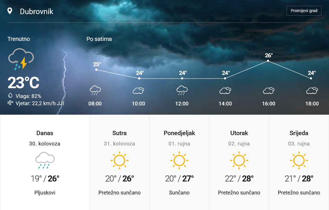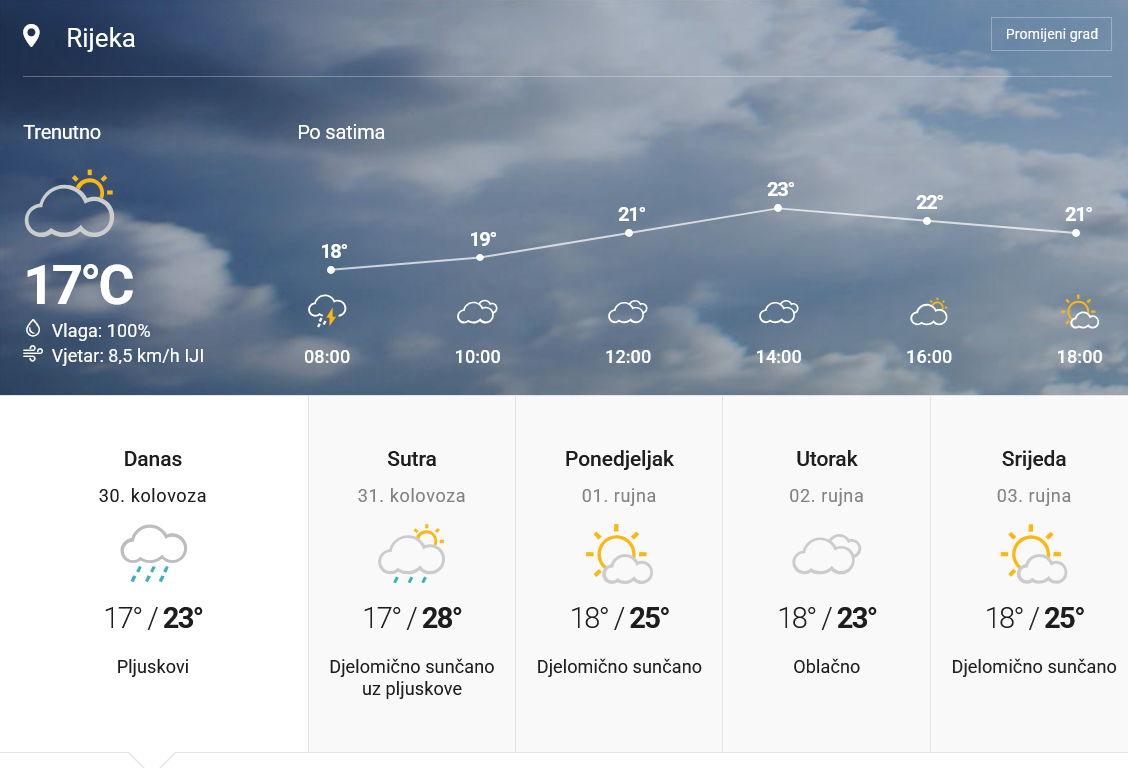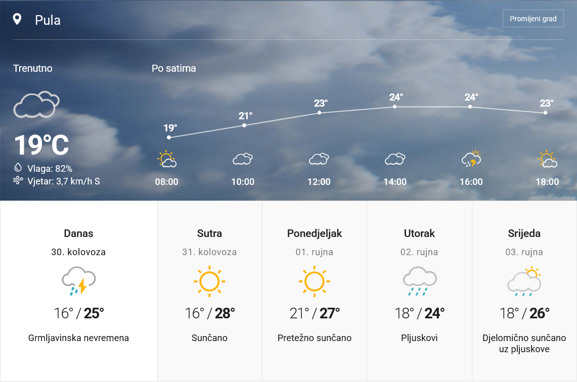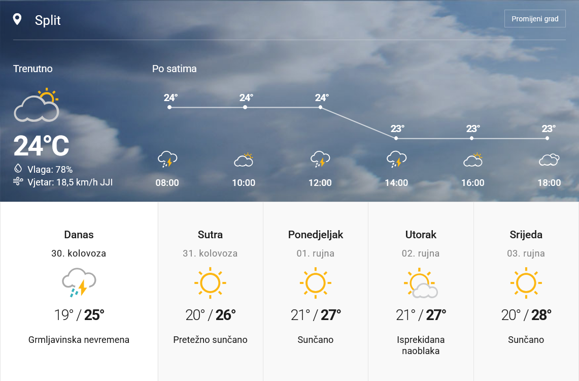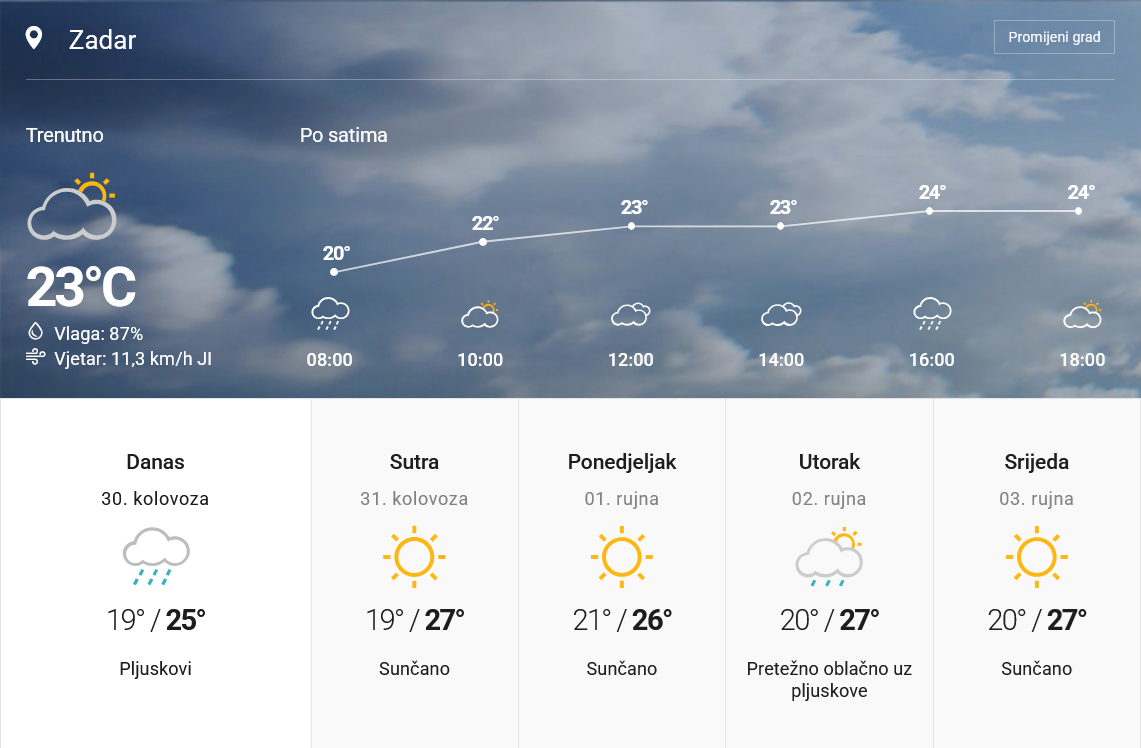 Promjenjivo oblačno i nestabilno. Mjestimice kiša, lokalno i obilniji pljuskovi s grmljavinom. Puhat će slabo do umjereno jugo i jugozapadni vjetar, a navečer će oslabjeti. Najviša temperatura zraka između 23 i 25 °C.