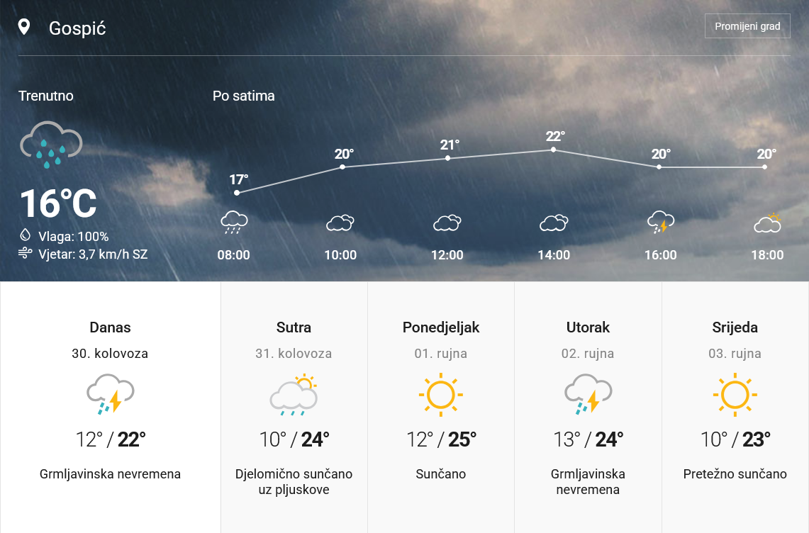 Promjenjivo oblačno, nestabilno i osjetno svježije. Mjestimice kiša i izraženi pljuskovi s grmljavinom, osobito u drugom dijelu dana. Vjetar slab do umjeren južni i jugoistočni, a uz nestabilnosti prolazno jak sjeverozapadni i zapadni. Najviša temperatura zraka između 23 i 26 °C.