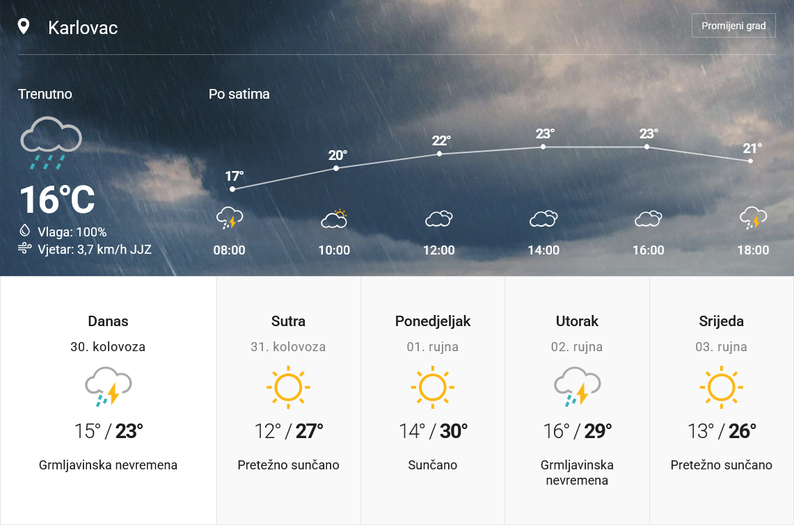 Grmljavinsko nevrijeme: Mogući izraženiji pljuskovi praćeni grmljavinom. Postoji rizik od lokalnih bujičnih i urbanih poplava. Vjerojatnost grmljavine > 50 %.
