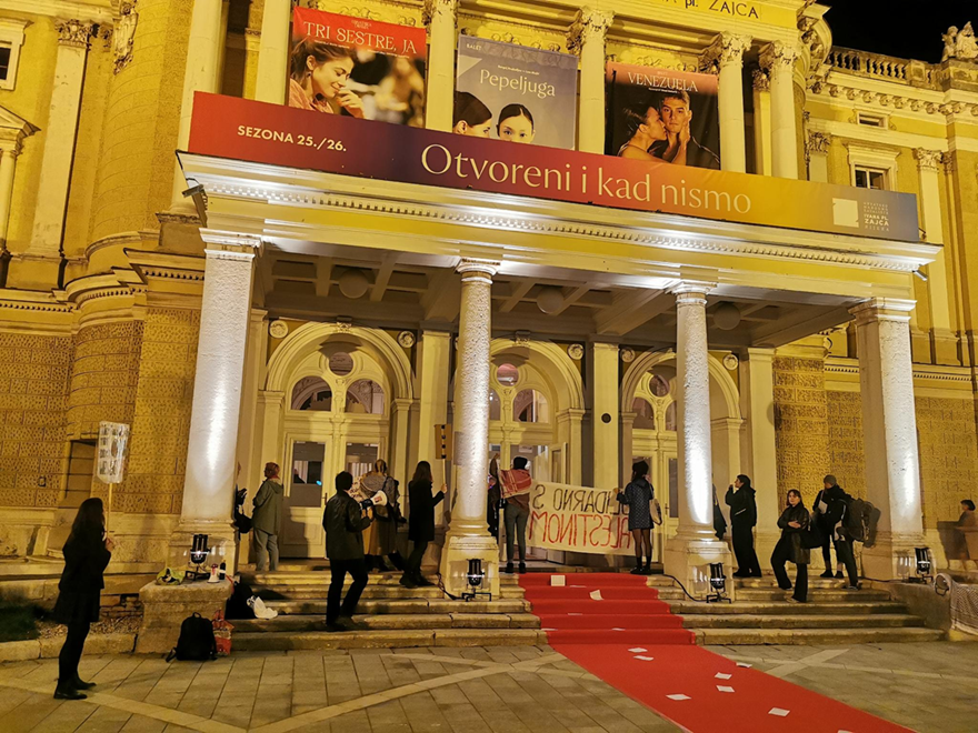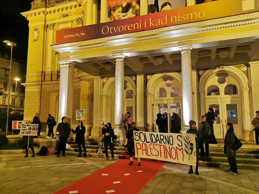 Prosvjed je počeo ispred kazališta, gdje su okupljeni zviždaljkama, sirenama i megafonima izražavali solidarnost s Palestinom i pozivali na "pravdu za Palestinu". Dio prosvjednika potom je ušao u zgradu HNK-a i prekinuo predstavu, prenosi Novi list.