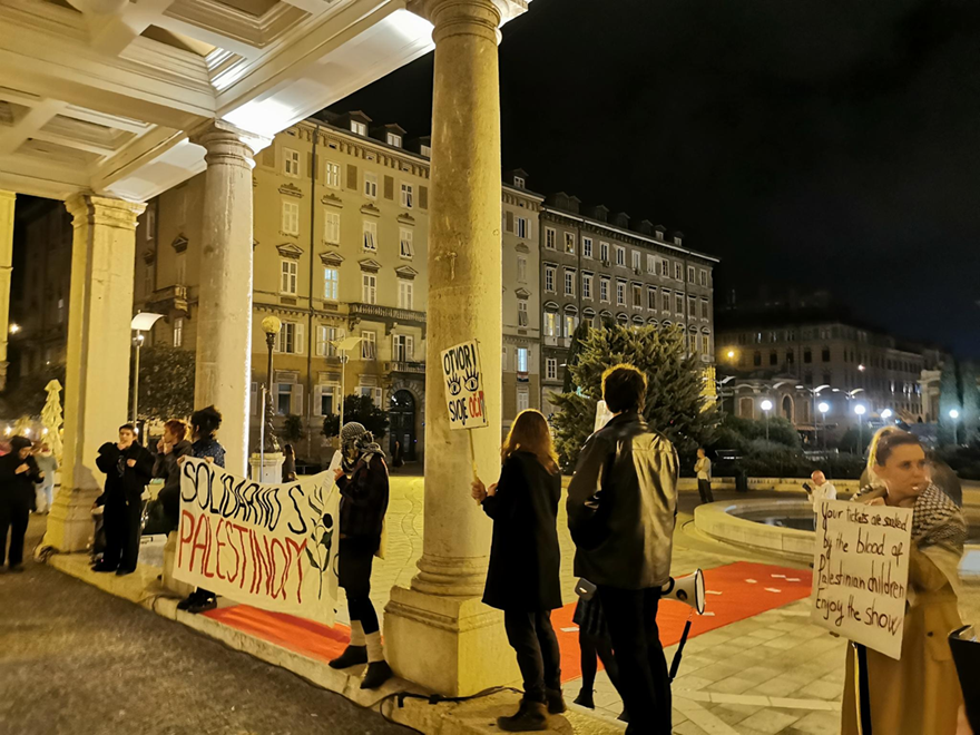 Ispred kazališta su, mirno držeći transparente s natpisima poput 'Solidarno s Palestinom', držali govore i dijelili letke građanima pozivajući ih na bojkot svih repriznih izvedbi. Istodobno, nekoliko je umjetnica i aktivista unutar dvorane kazališta izvjesilo transparente s natpisima 'Stop artwashingu genocida' i 'U Rijeci Gaga, u Gazi grobnice' te zviždaljkama prekinulo početak predstave.