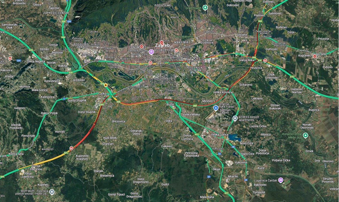 Na naslovnoj slici je snimka zaslona Google Traffica od 13:34 sati. Kako se vidi, dominira gusto crvena boja što znači da se promet jedva kreće.