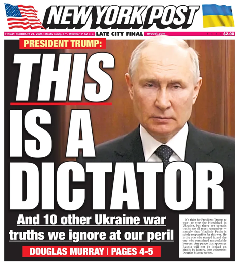 NA NASLOVNICI jučerašnjeg izdanja New York Posta objavljena je fotografija ruskog predsjednika Vladimira Putina uz naslov: "OVO JE DIKTATOR i 10 drugih istina o ukrajinskom ratu koje ignoriramo na vlastitu opasnost."