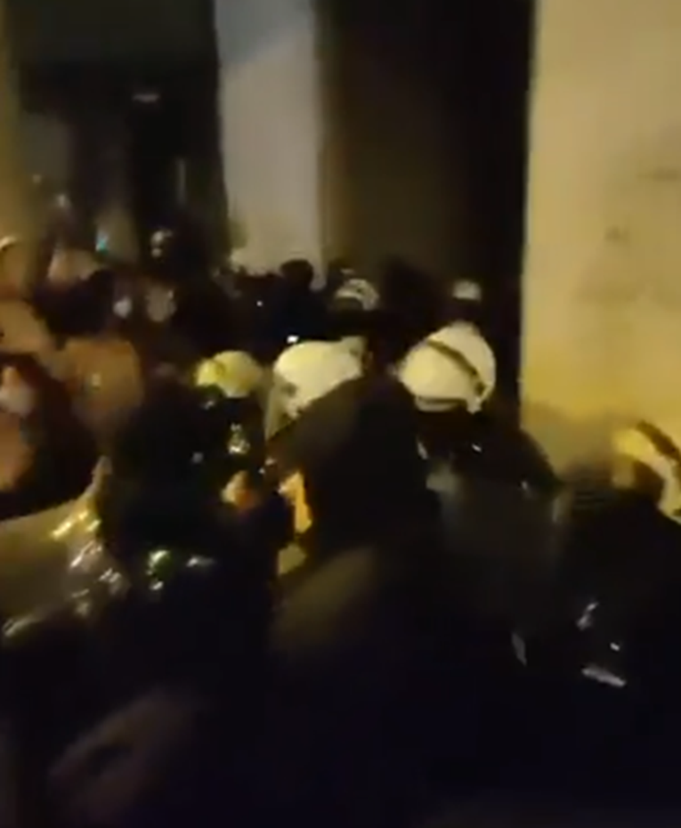 U tom trenutku interventna policija pojavila se iz pravca dvorišta i počela pendrecima tući ljude kako bi nasilno uklonila studente koji su blokirali ulaz. U tom sukobu nekoliko studenata je zadobilo ozljede. Interventna policija je zatim pokušala potisnuti studente prema žandarmeriji, nastavljajući s primjenom sile.