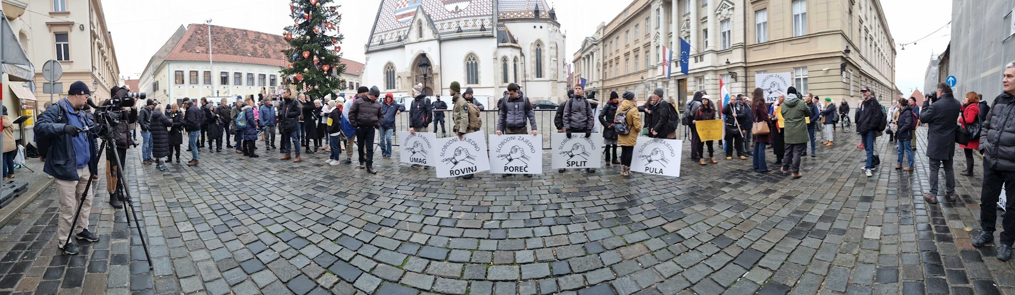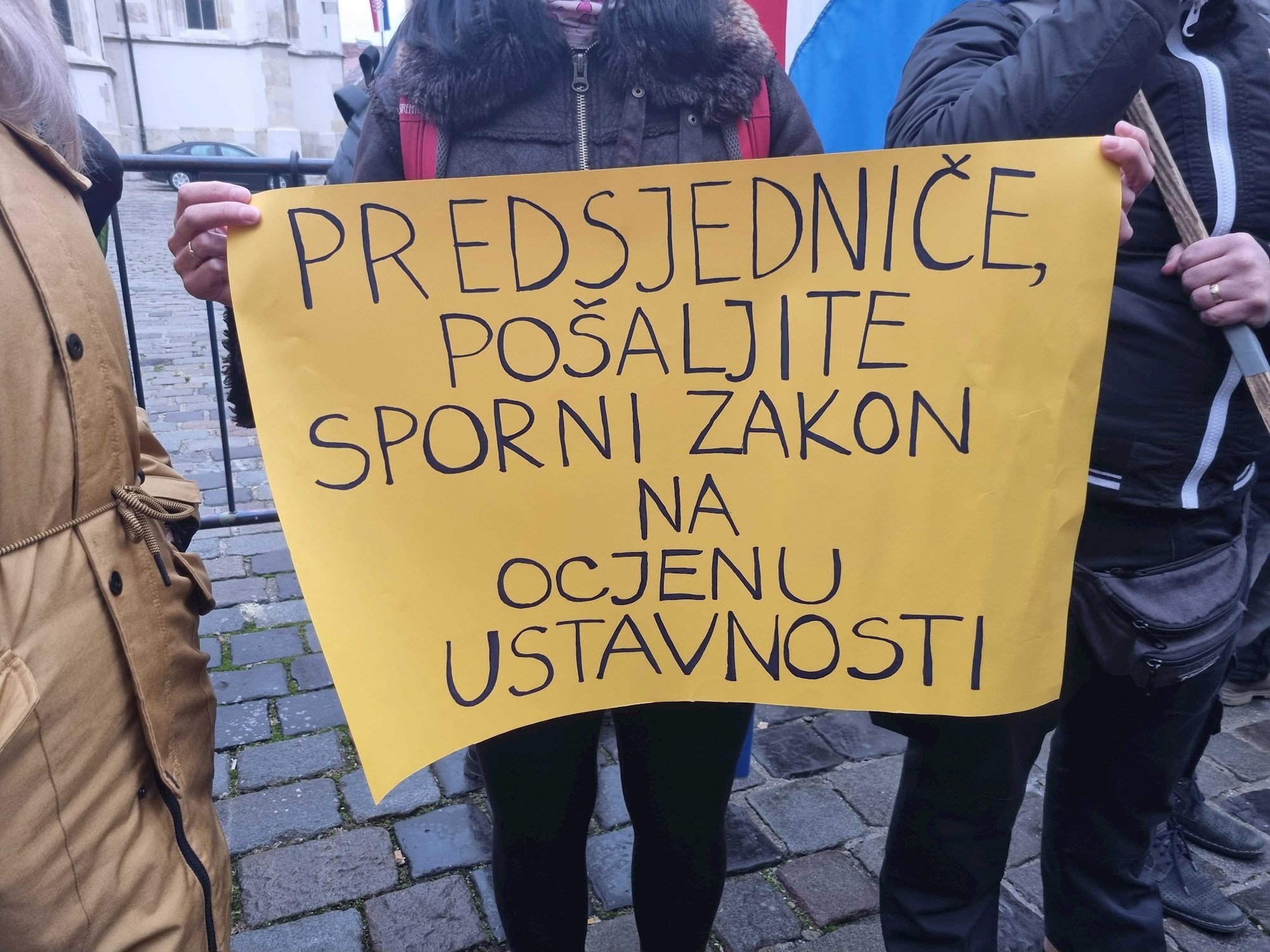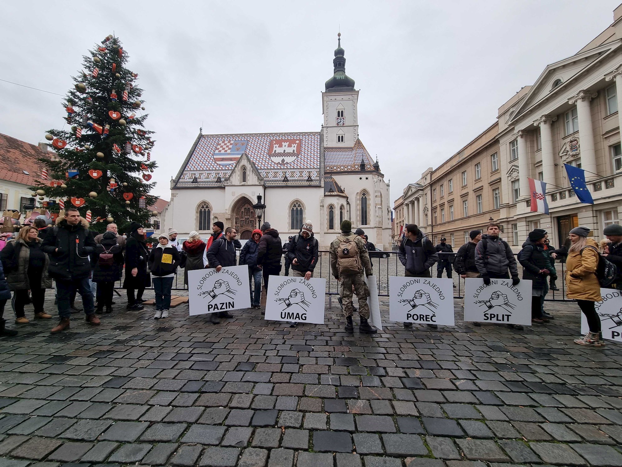Prosvjednici su se okupili na Markovom trgu jer je u saboru danas na rasporedu glasanje o izmjeni Zakona o zaštiti pučanstva od zaraznih bolesti, kojim bi se uvele visoke kazne za nepoštovanje odluka o covid-potvrdama.