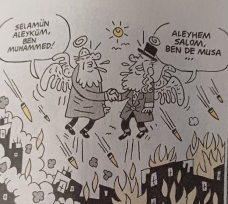 TURSKA policija jučer je privela najmanje četiri karikaturista optužena za crtanje i distribuciju karikature za koju vlasti i prosvjednici tvrde da prikazuje proroka Muhameda i Mojsija. Karikatura, objavljena u satiričnom časopisu, prikazuje, čini se, muslimana i Židova, obojicu s krilima i aureolama, kako se rukuju i pozdravljaju dok bombe padaju ispod.