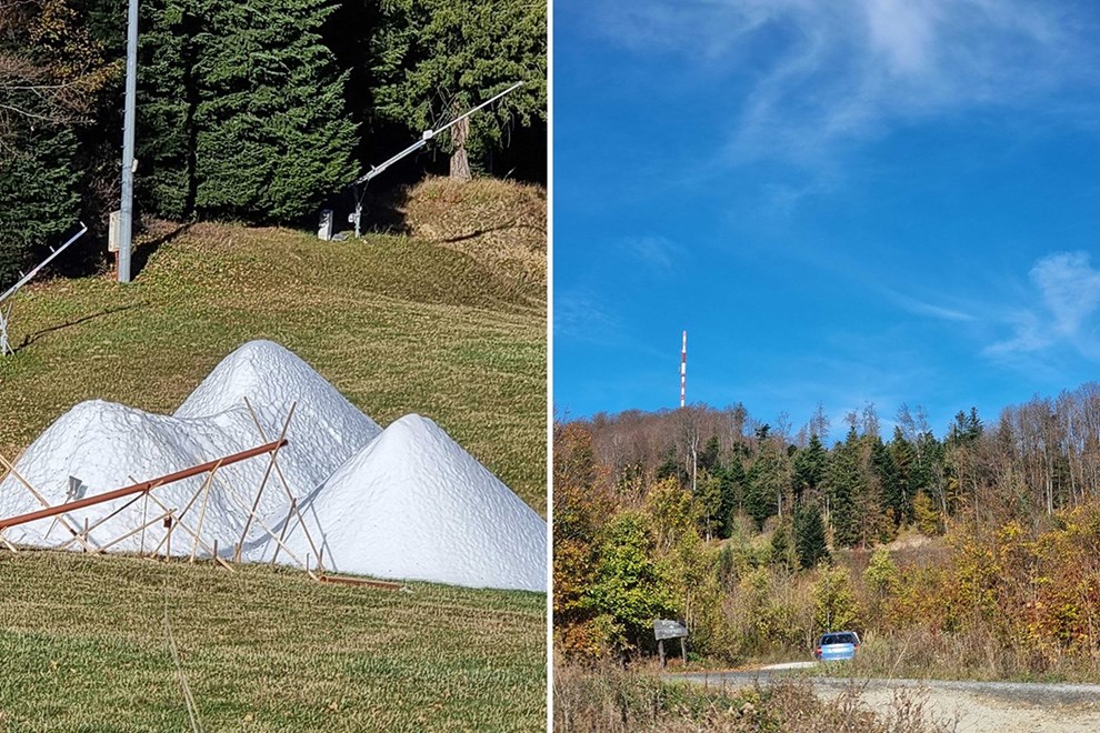 INDEXOV reporter prijepodne je bio na Sljemenu. Vrijeme je tamo za kratke rukave, bilo je desetak stupnjeva toplije nego u Zagrebu. A na Crvenom spustu tri hrpe snijega koje je jučer napravio stroj koji se zove tvornica za led.