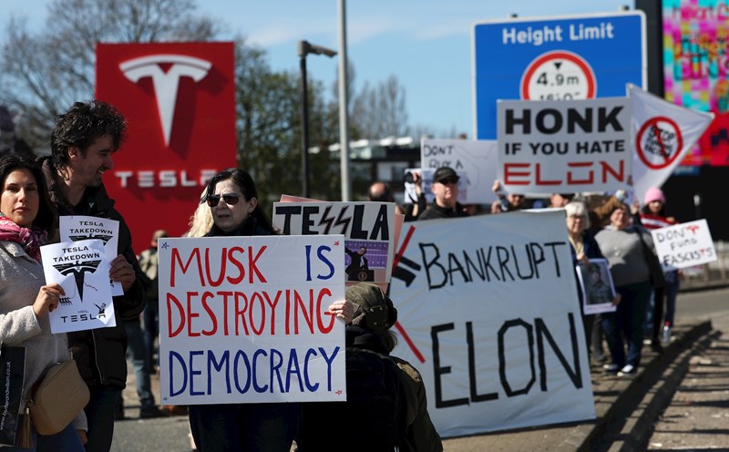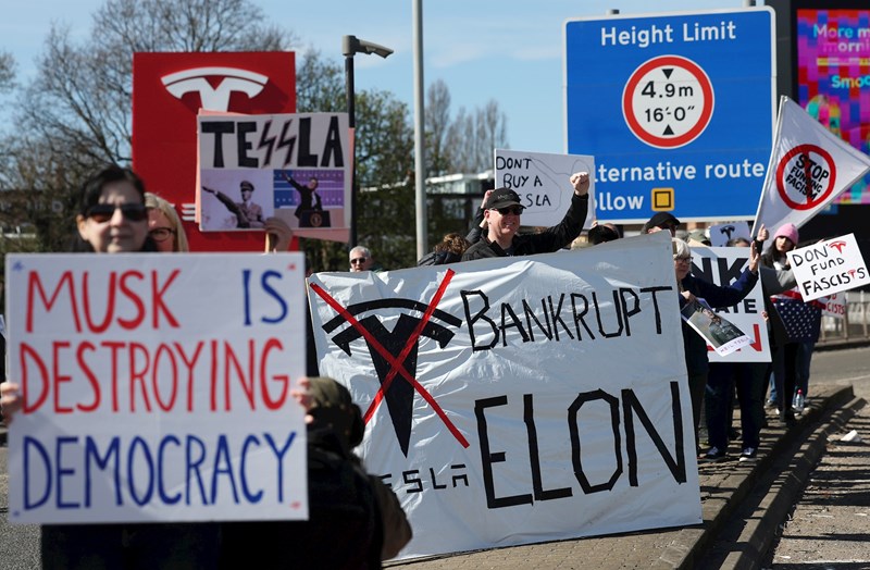 U Londonu je održan prosvjed uz cestu A40 ispred Teslinog salona. Aktivist Nigel Warner rekao je da Musk "financira krajnju desnicu i zastrašuje republikance koji se ne slažu s Trumpom".