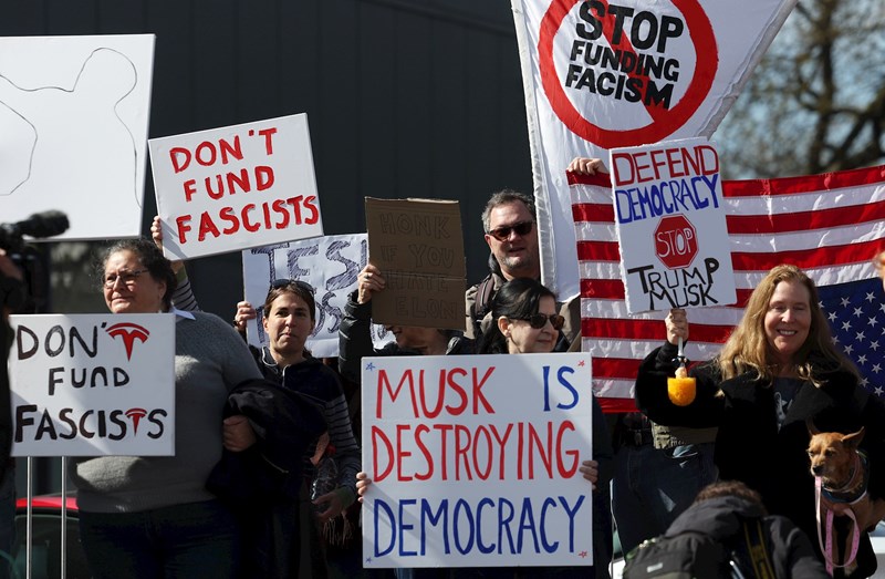 Marty (82), koji je šezdesetih prosvjedovao protiv rata u Vijetnamu, rekao je: "Danas prosvjedujem jer me strah za svoju zemlju. Ovo je pokušaj oligarha da preuzimu državu." U Washingtonu je održan prosvjed pod nazivom "Tesla Takedown Dance Party" - uz ples, glazbu i poruke poput "Odbaci meme-dionice, priključi se plesnoj koloni!"