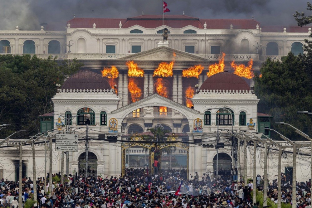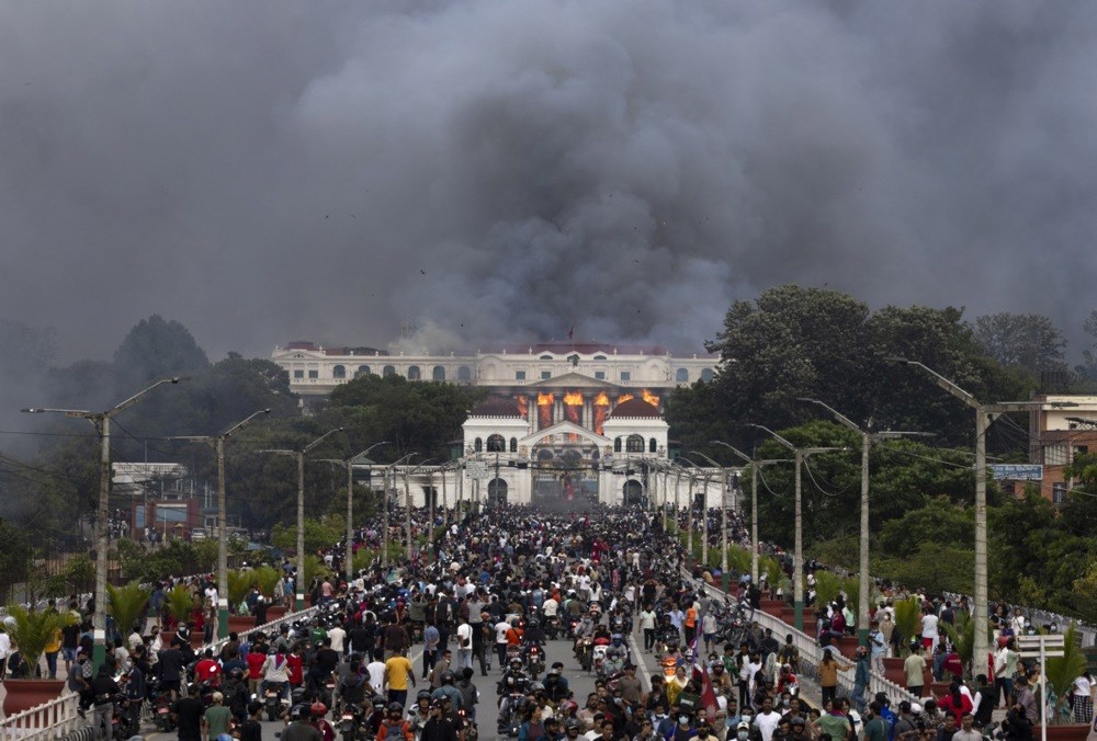 Na zgradi Singha Durbar, u kojoj se nalaze parlament i sjedište vlade, snimljeni su plamen i dim, a velike mase ljudi probile su se cestom prema kompleksu. U Kathmanduu je upravo prošla 20 sati, a prosvjedi protiv vlasti i dalje potresaju nepalsku prijestolnicu.