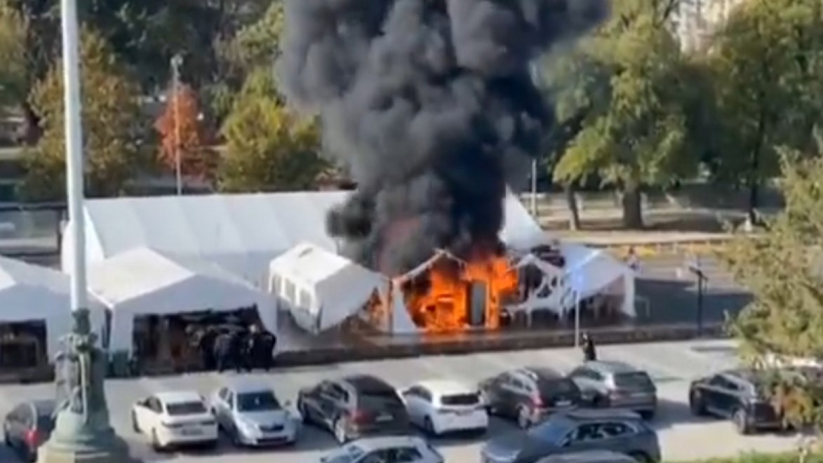 Veliki požar ispred Narodne skupštine Srbije u parku poznatom kao "Ćacilend" izbio je nakon pucnjave, objavila je oporbena političarka Marinika Tepić. Na početku snimke vidi se muškarac koji šepa, kao da je ranjen, nakon čega prema šatorima trči više policajaca i čuju se pucnjevi.
